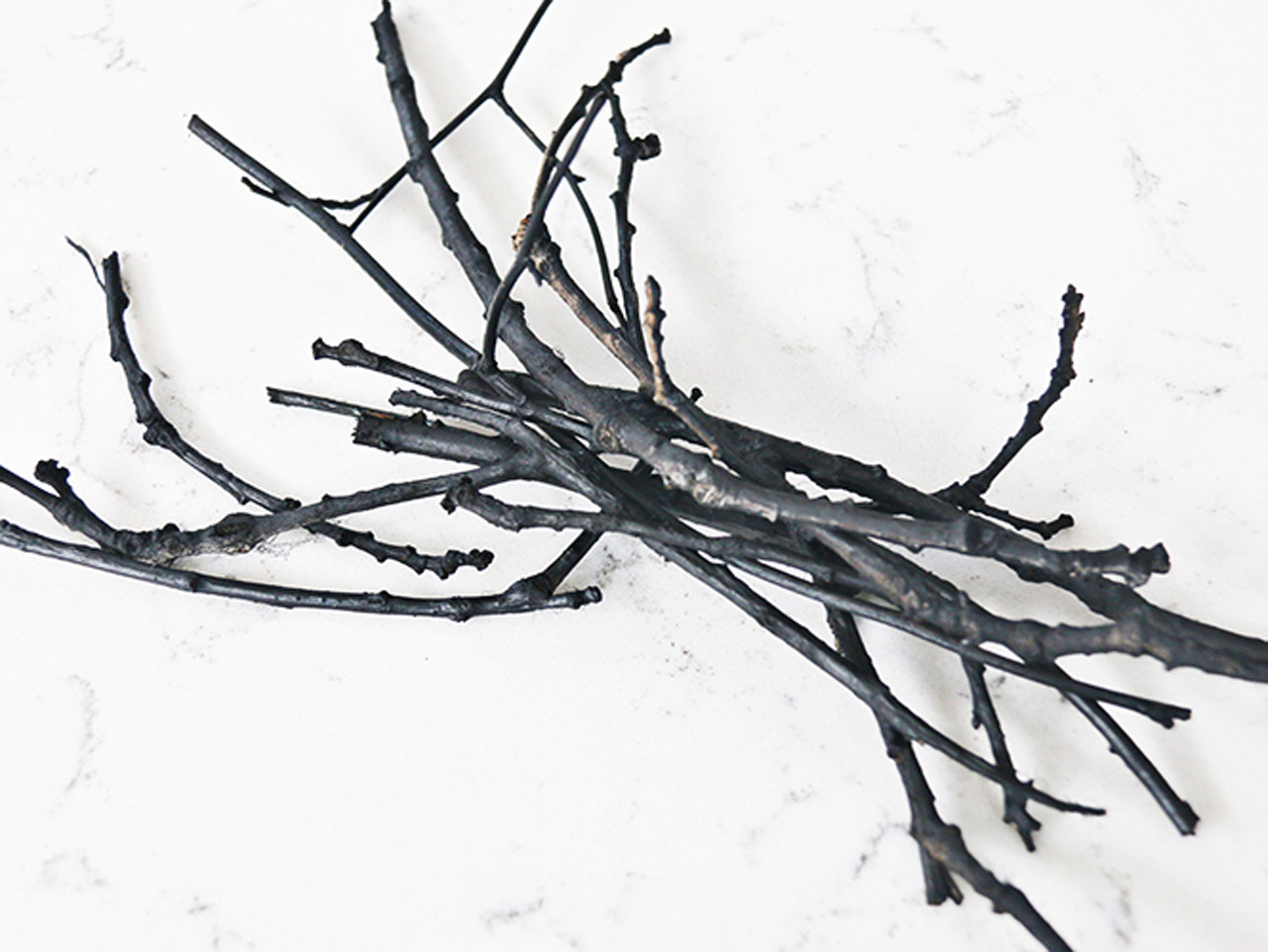 Lay out the sticks on cardboard, or in a cardboard box. Lay them close together, but not touching. Spray with black spray paint until the top side is coated. Allow the sticks to dry for 20 min. After they are dry, turn each stick over and repeat the painting process. Allow the sticks to fully dry.