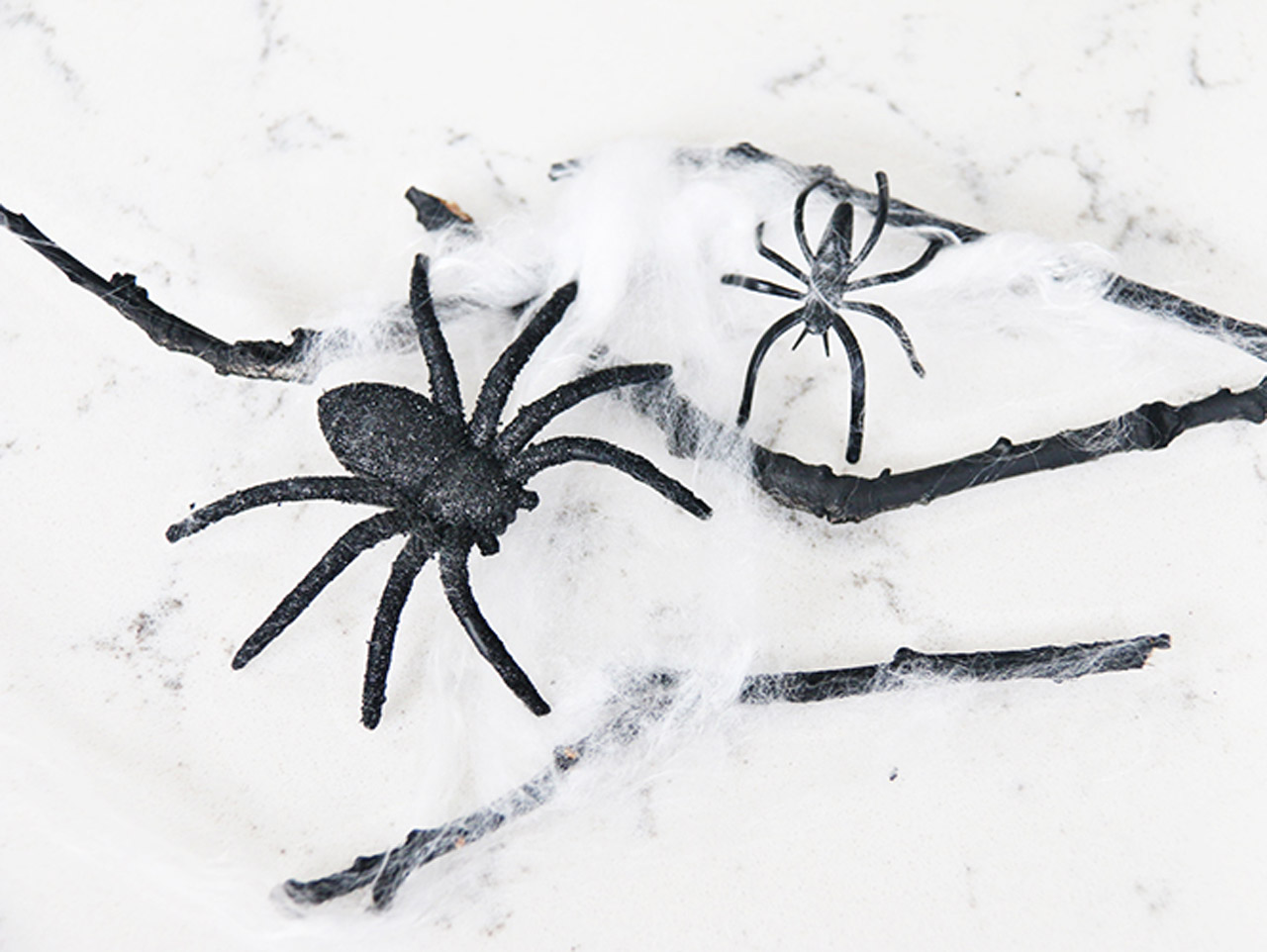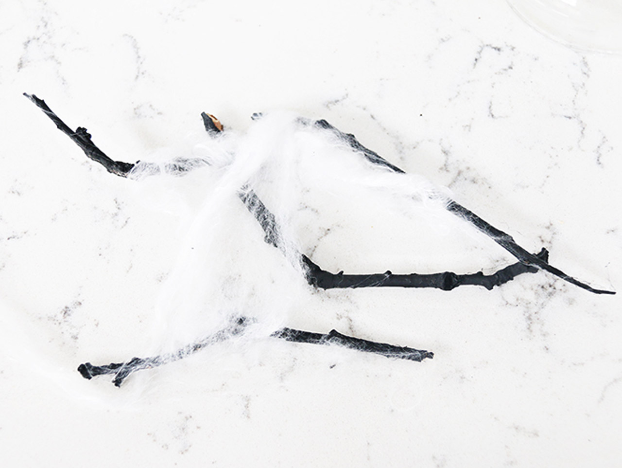 Take a few sticks and wrap them in some stretchy spider webs. I found that the spider webs go a long way! You just need a small handful for each jar. Try wrapping the sticks a few times in certain places. It looks better with thinner webbed areas and some thinker ones too.