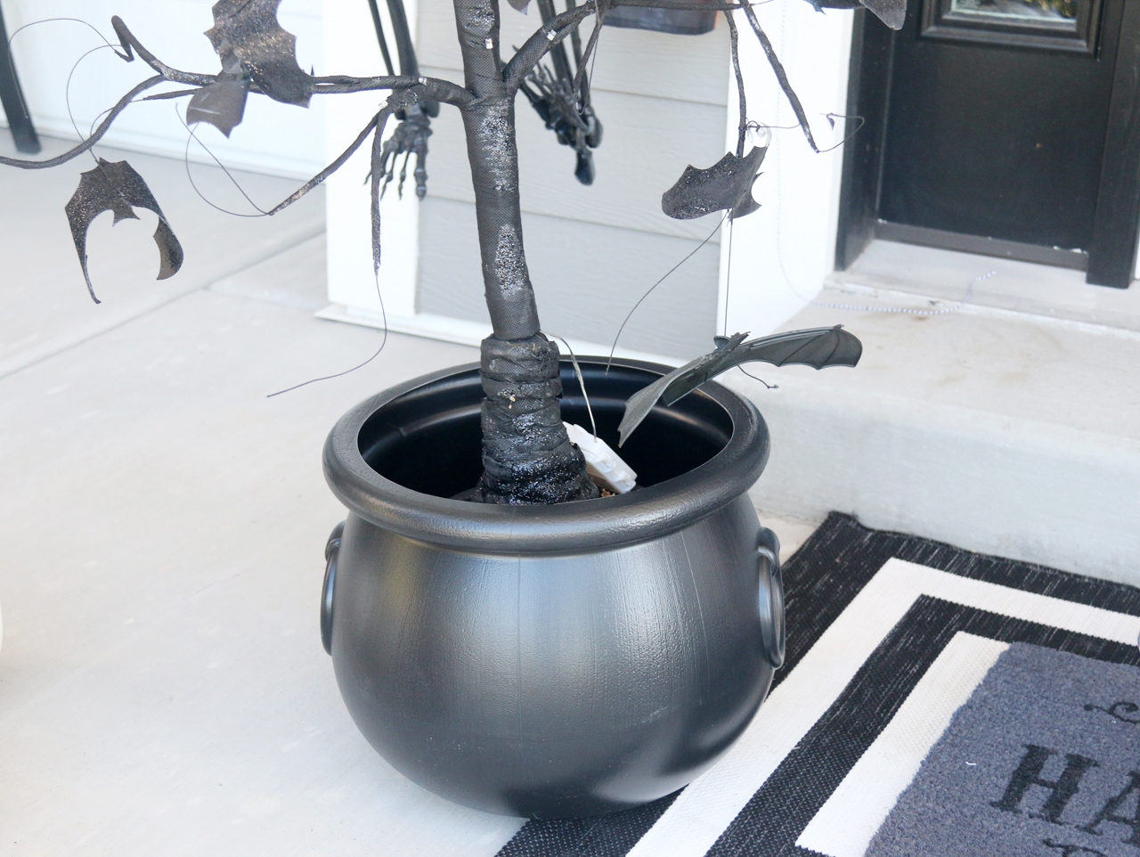 Place the Light Up Creepy Tree inside the Black Cauldrons. Add some rocks around the bottom of the cauldron to add some weight and make the cauldron tree a little more sturdy.