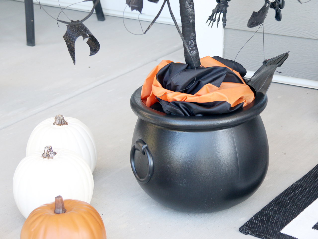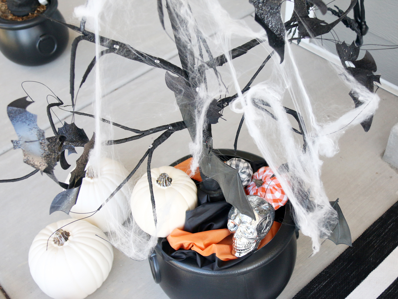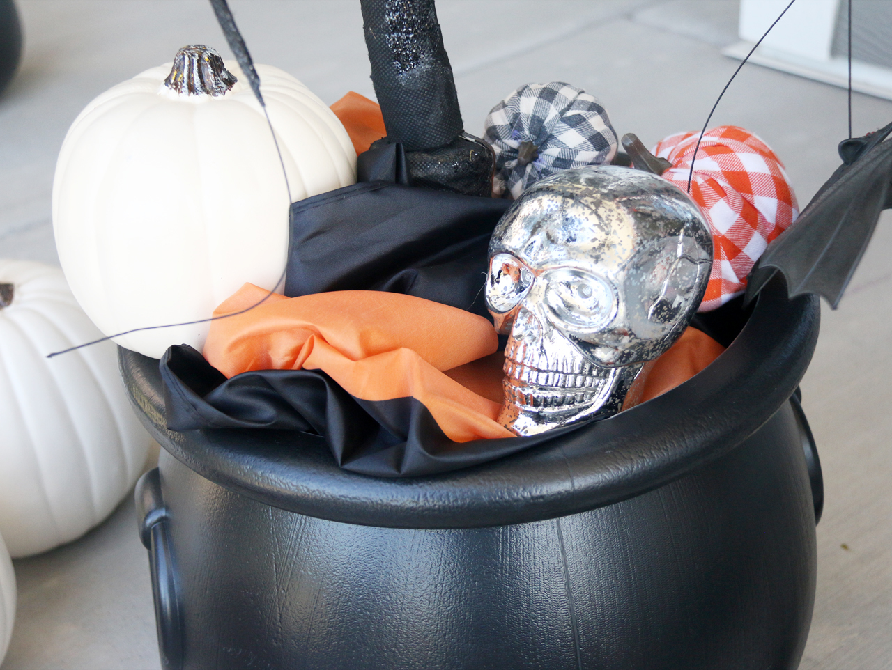 Add Skulls, Black Crows, and mini pumpkins to the top of the cauldrons.