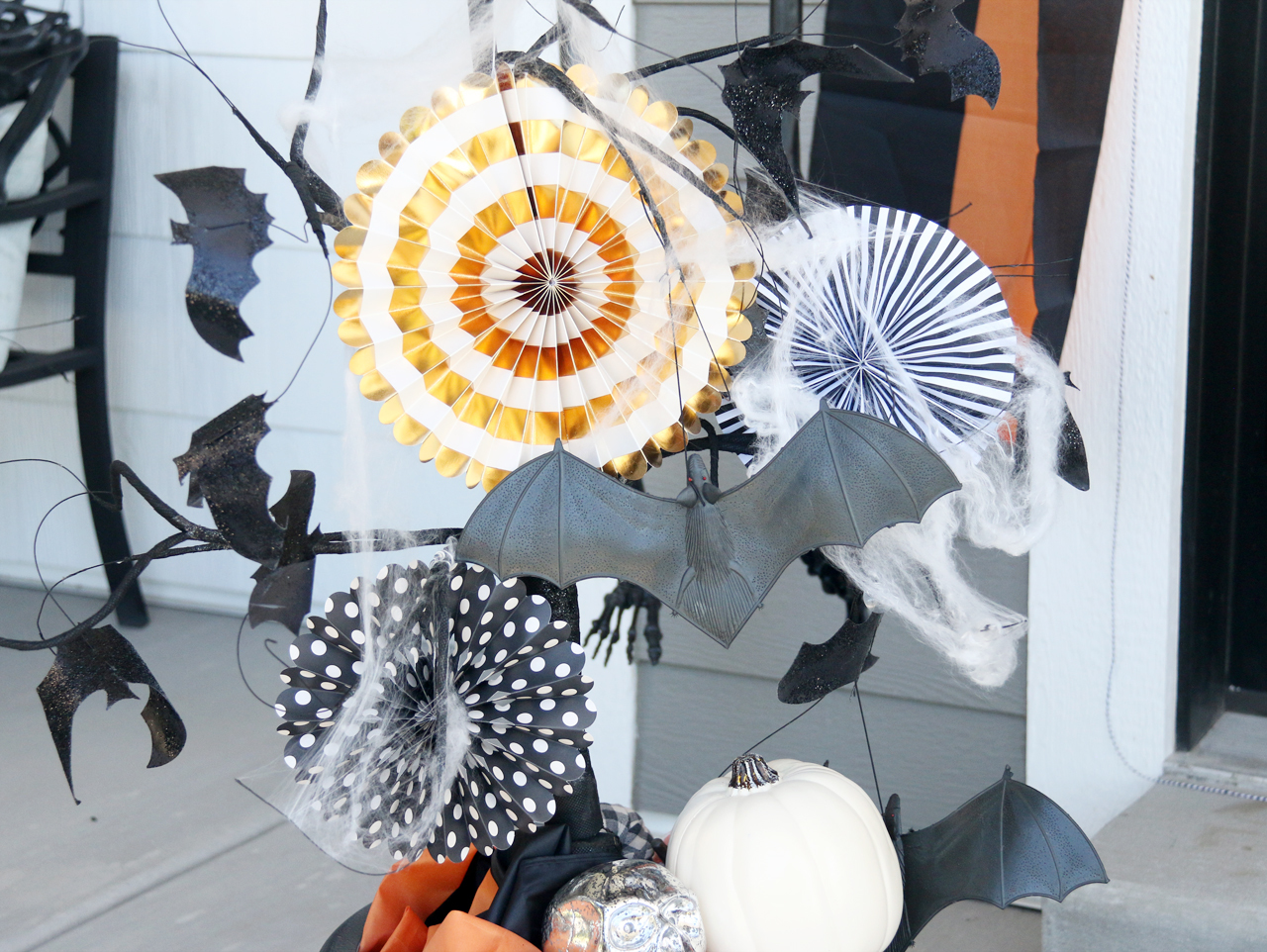 Hang Festive Halloween Paper Fans from the spooky trees. You can also add some cool Hanging Bats to the tree.