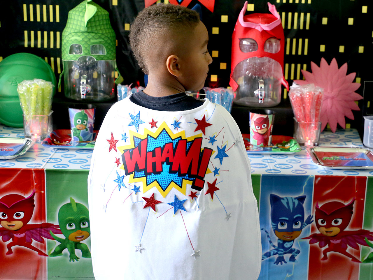 Tie the finished cape around each of your guests. This is a perfect party activity and party favor for the PJ Masks party!