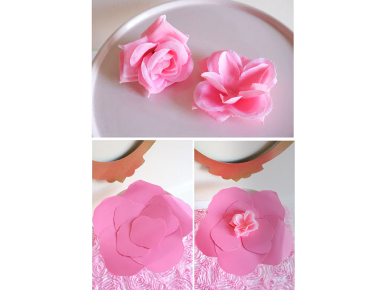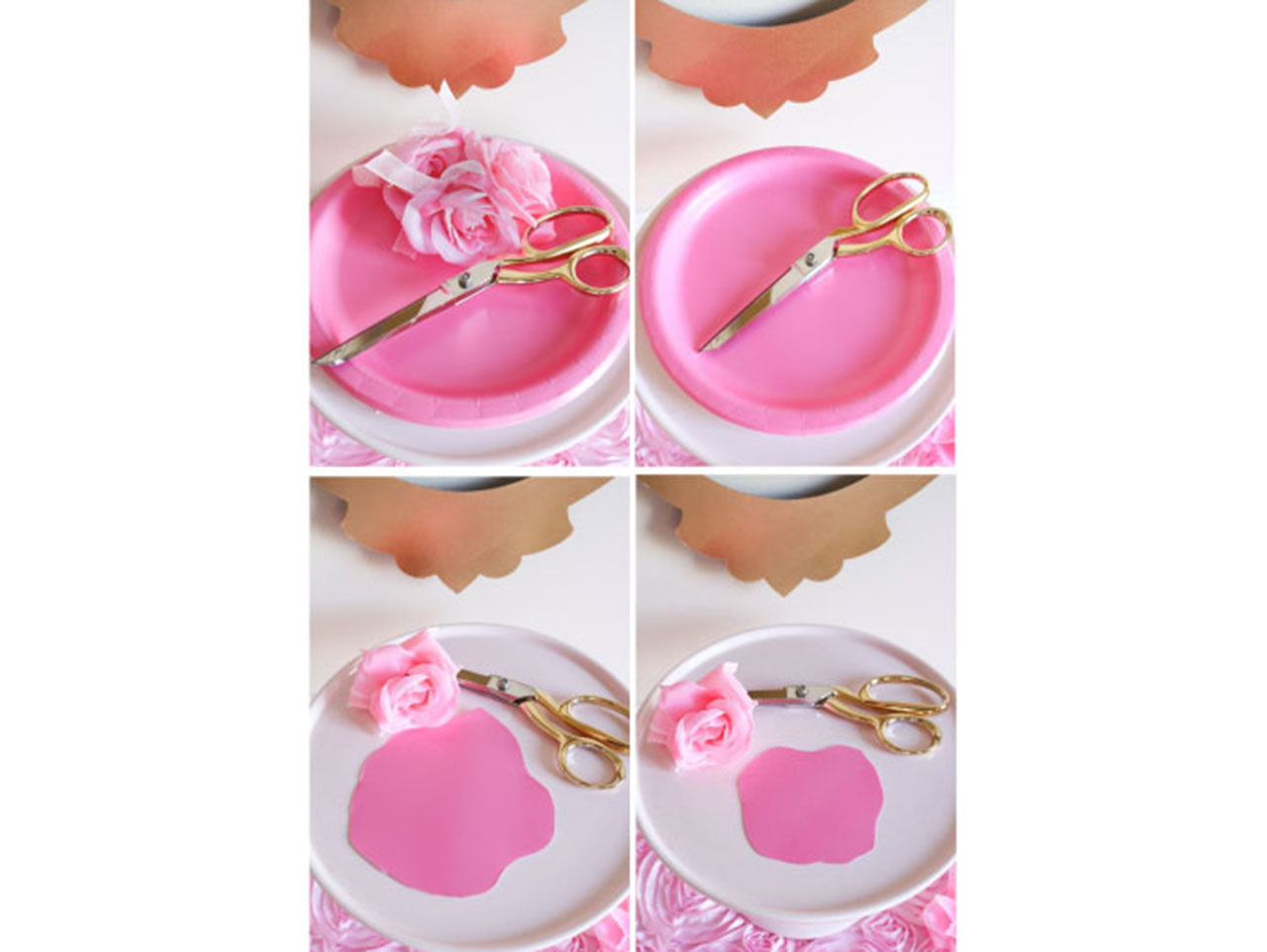 Start by gathering up 10 Candy Pink Round Dinner Plates, a Pink Rose Garland, scissors and hot glue. Using your scissors, freehand cut 5 large rose petals and 4 small rose petals out of the Candy Pink Round Dinner Plates. Save one dinner plate for a later step. Simply cut out any random shape! Now, using your scissors, trim the rose from the Pink Rose Garland and remove the firm center from the flower. Using a few dabs of hot glue, adhere the paper plate petals to the Candy Pink Round Dinner Plate you put aside. Then, adhere the rose petals from the Pink Rose Garland to the center of the paper plate rose and hang framed by a Gold Glitter Picture Frame Cutout above your candy cart!