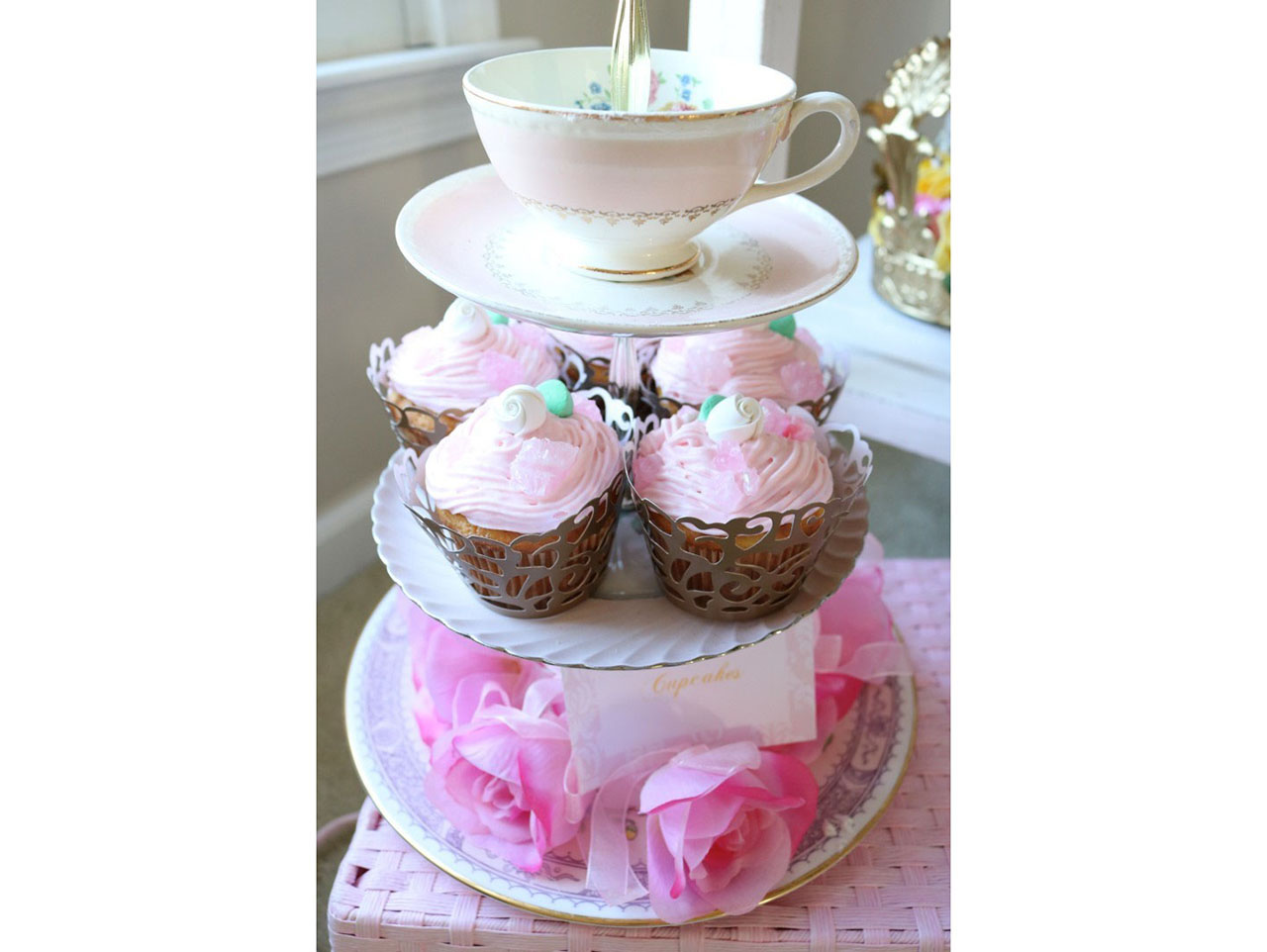 We displayed all of our sweets on our candy buffet so the kids could easily grab what they wanted from one location and head back to their seats. We displayed our floral draped birthday cake, our Royal Rock Candy Cupcakes, and of course, plenty of candies!