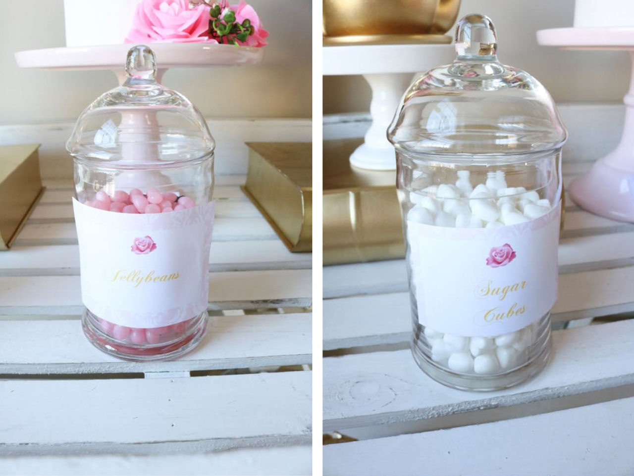 To get the look we created for our candy jars. First, fill the Glass Jar Set and Chalkboard Candy Jar with your candies. We opted to include heart-shaped marshmallows, Pink Rock Candy Lollipops, Pink Jellybeans Candy, and Pearl White Hard Candy Hearts in our jars. After filling your jars, print out our Free Printable Food Labels and add them to the front of the candy containers with a bit of double stick tape.