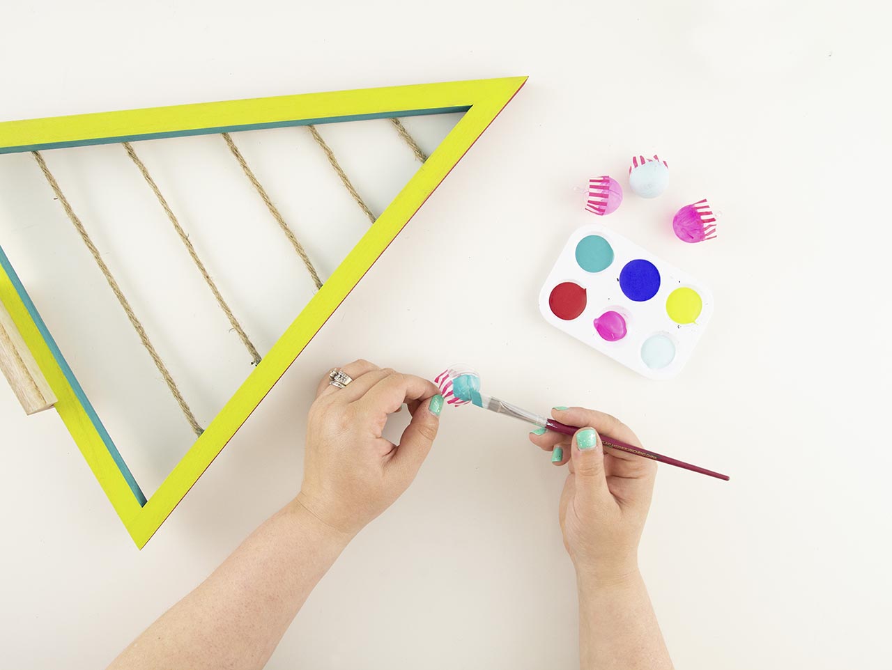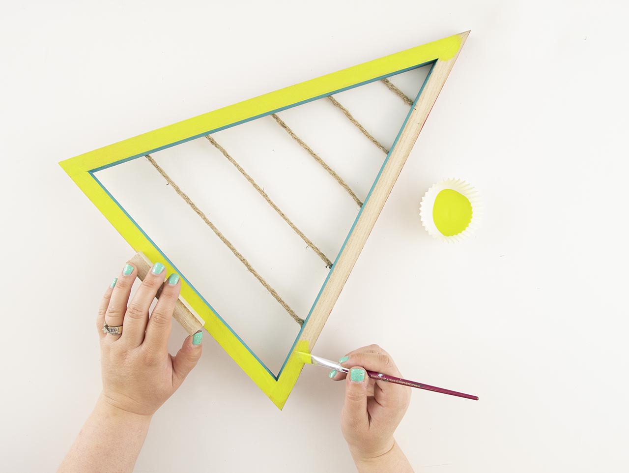 Use a flat-bristled paint brush and acrylic paint to paint the DIY Unfinished Wood & Rope Christmas Tree.
