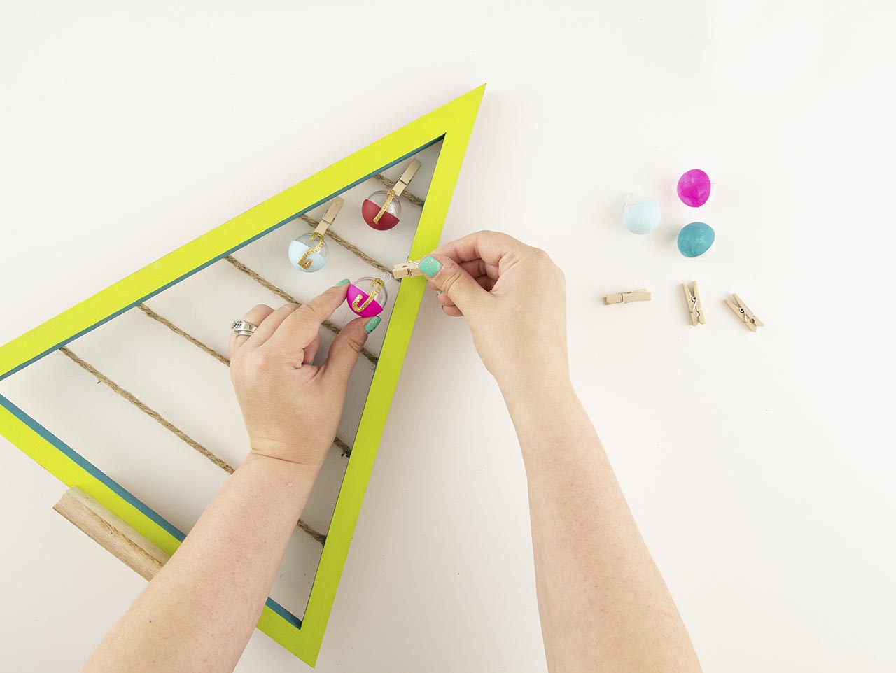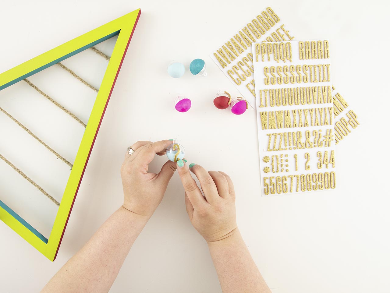 Adhere Gold Glitter Thicker numbers to the mini clear ornaments and use hot glue to make sure they stay in place. Fill the ornaments with small candy, toys or goodies. We filled ours with little printables. You can download your own Random Acts of Christmas Kindness Tickets here. Clip the ornaments onto the twine with a small clothespin.