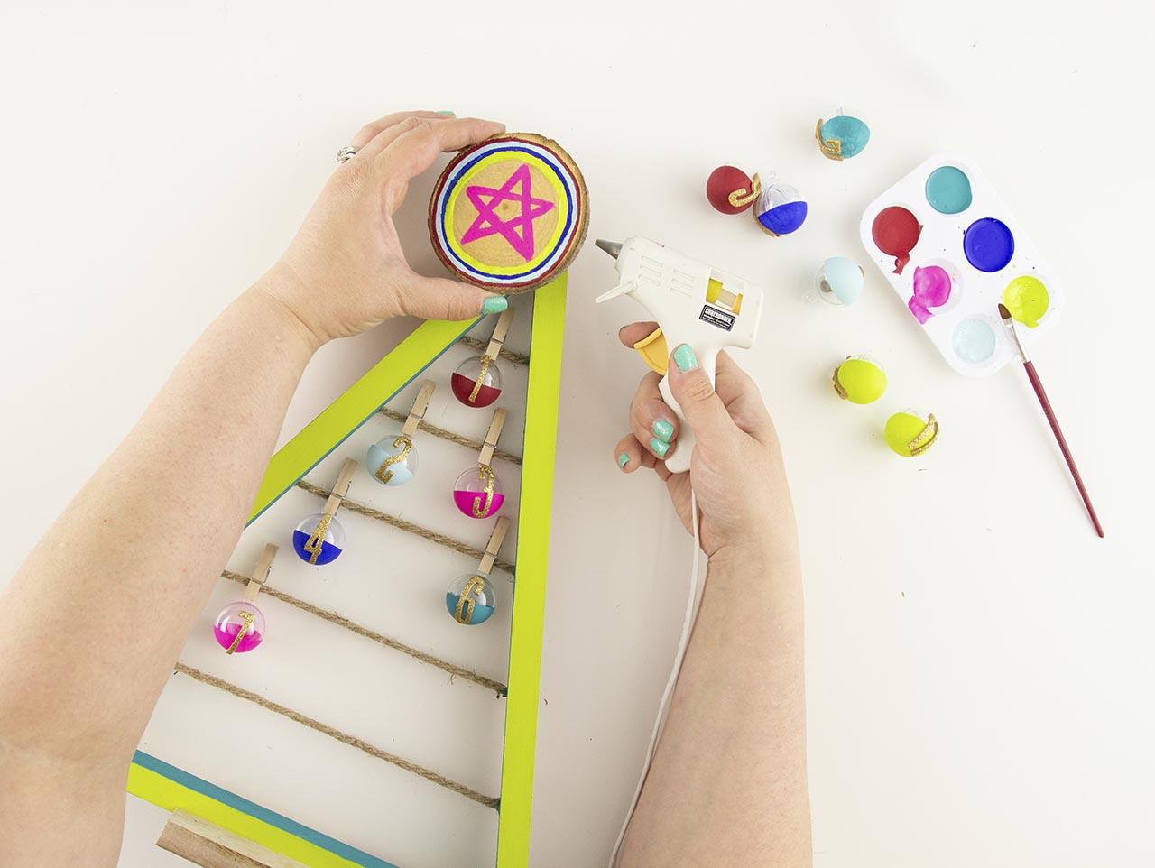 Paint a star design onto a Wood Slice Coaster. Once the paint is dry, hot glue the coaster to the top of the wood tree.