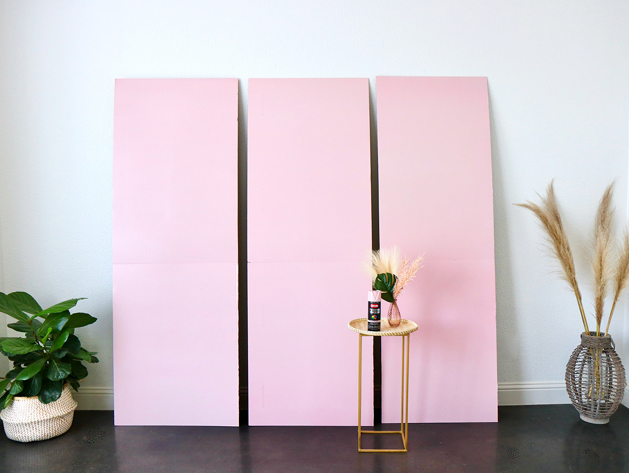 Take the backdrop boards to a well-ventilated space and spray paint each piece light pink. Alternately you could mix magenta acrylic paint and white acrylic paint together to achieve a light pink to hand paint each board.