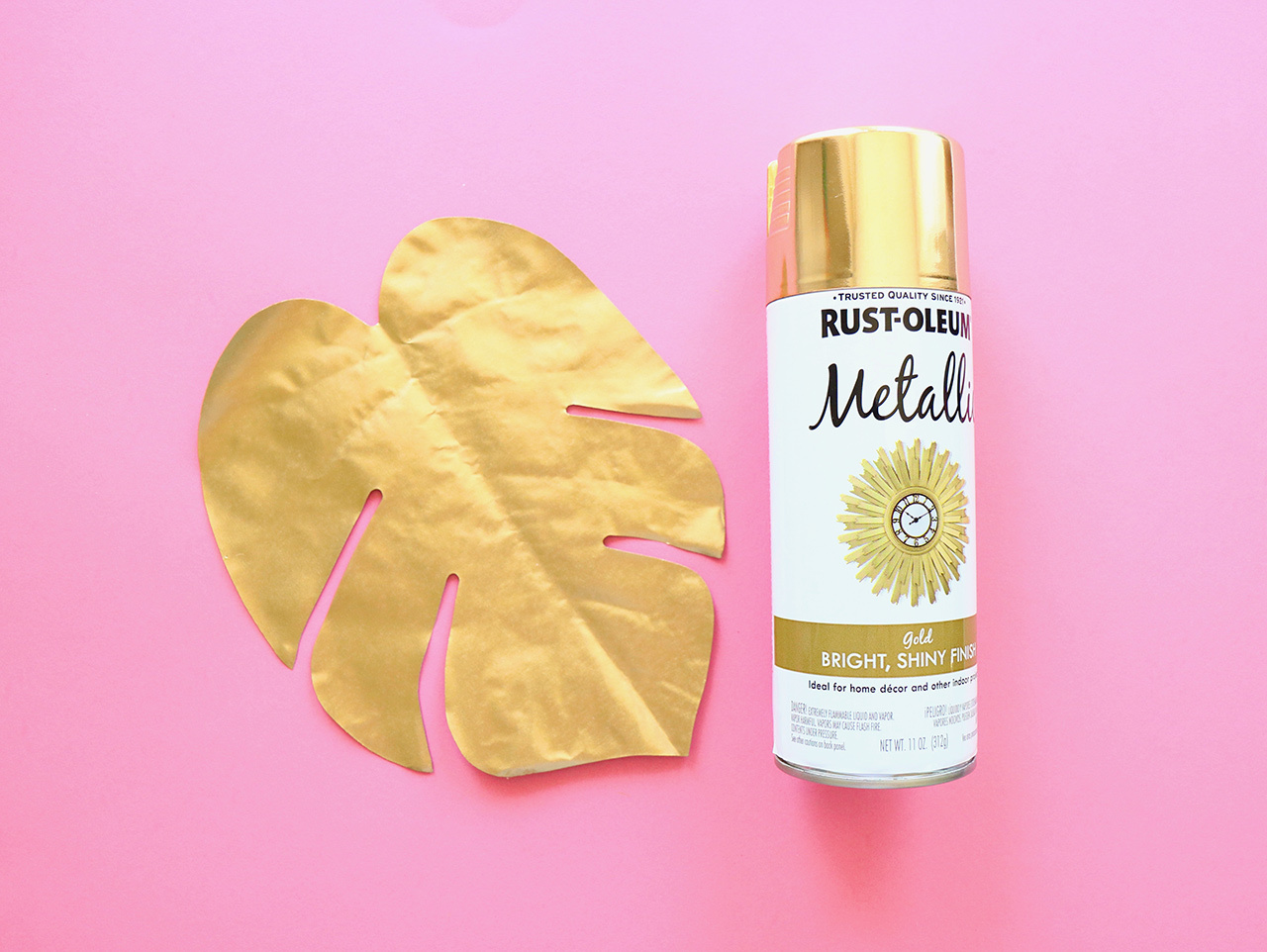 While the paint on the backdrop boards is drying, paint several Large Artificial Monstera Leaves and Artificial Tropical Leaves with gold spray paint.