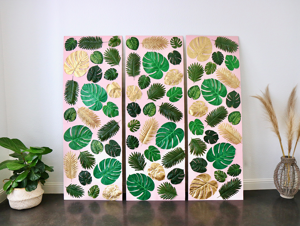 Once the paint has dried on the backdrop boards and leaves, use hot glue to attach Large Artificial Monstera Leaves and Artificial Tropical Leaves, Metallic Gold Palm Leaves, Metallic Gold Tropical Leaves, Medium Polyester Palm Leaves and leaves from a Faux Palm with Gold Accents Garland and a Faux Tropical Palm Garland to each of the backdrop boards. Be sure to vary the direction of the leaves for visual interest.