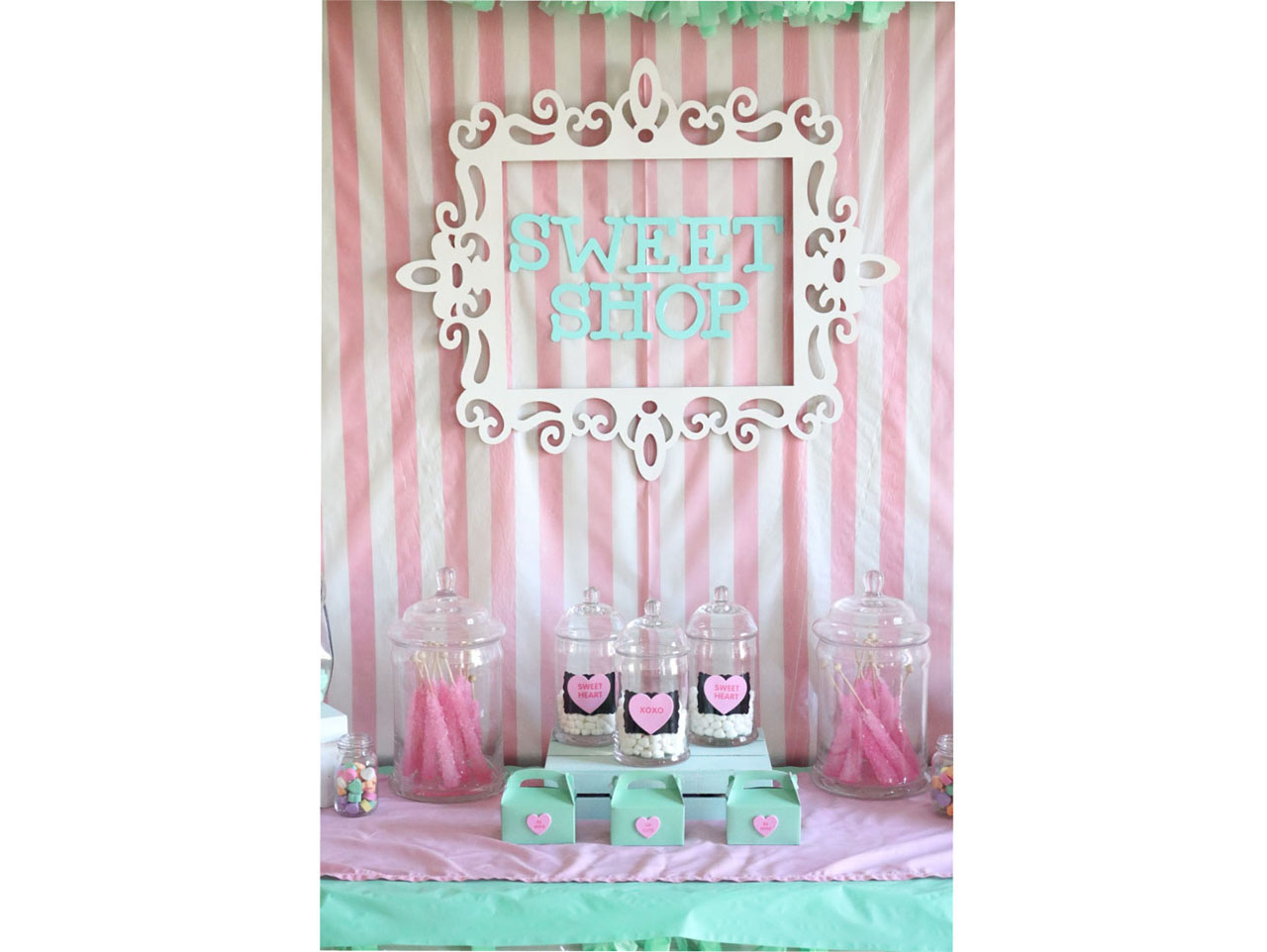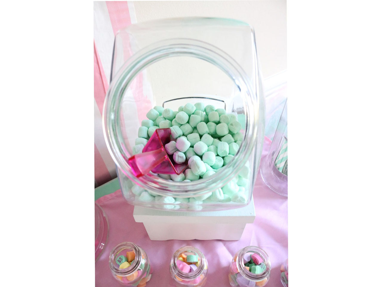 Layer your sweet shop stand with the Mint Green Plastic Tablecloth Roll and a pink table runner to add even more color. This is such a simple and inexpensive way to dress up a table, and the layering makes it look more expensive than it actually is.