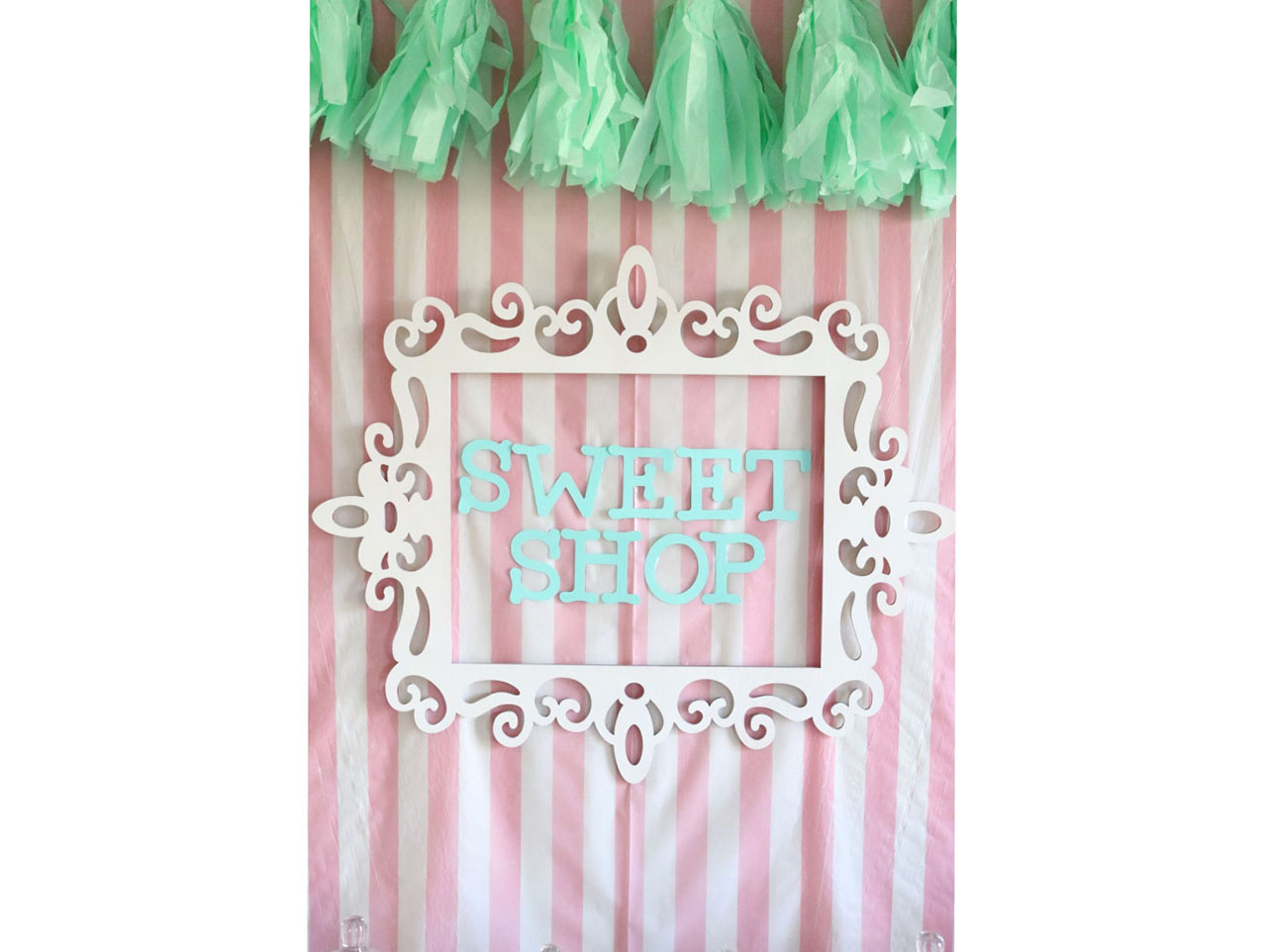 Start out by using the Pink and White Striped Plastic Tablecloth Roll as a backdrop. Simply secure it to the wall with a bit of tape and trim it to the length you need. Add the “sweet shop” lettering with a bit of double stick tape and voila! Instant backdrop in minutes.