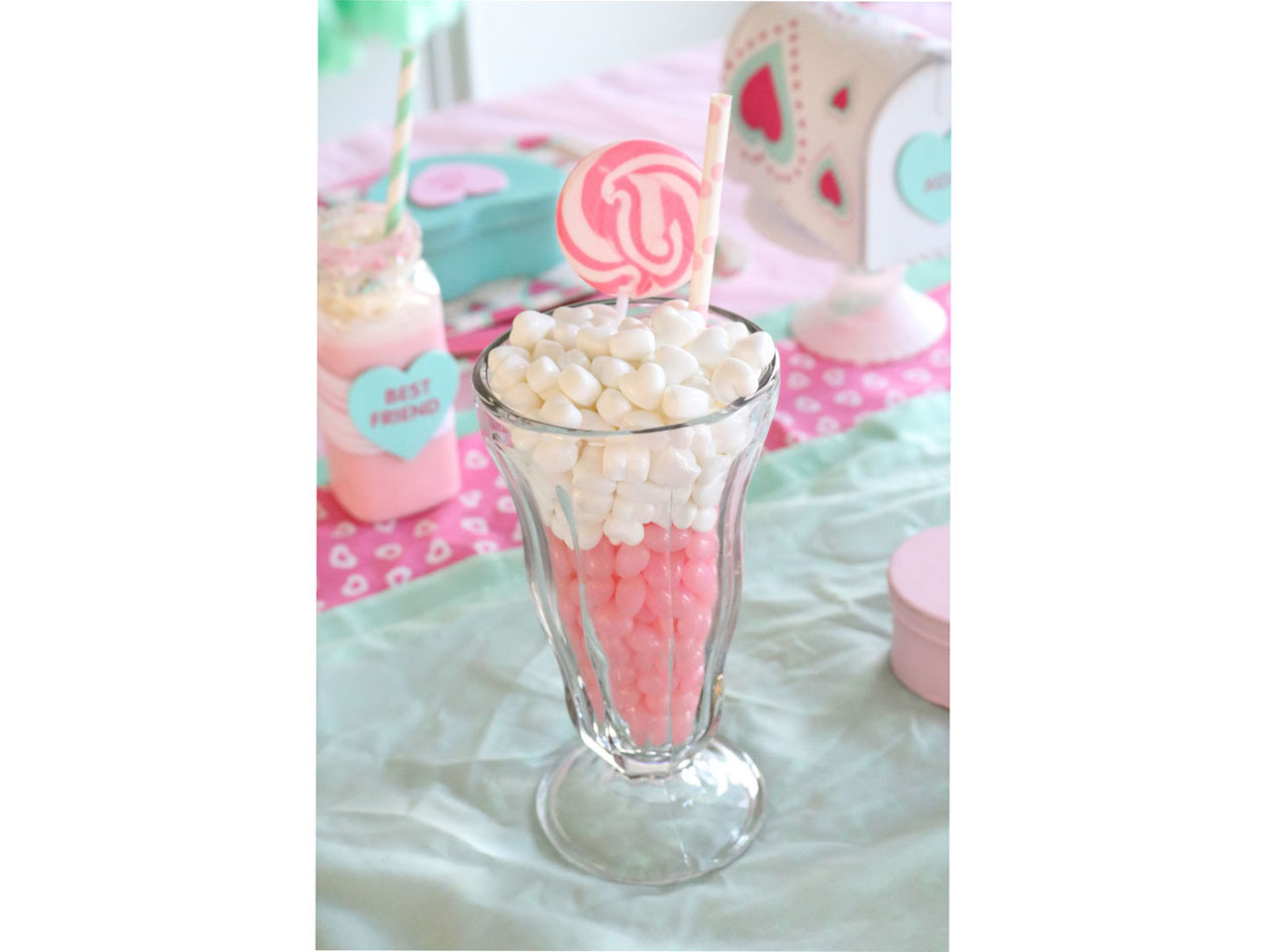 Pink Jelly Beans Candy topped with Pearl White Hard Candy Hearts were displayed in vintage milkshake glasses and adorned with a Pink Swirl Lollipop and a Pink Polka Dot Paper Straw detail.