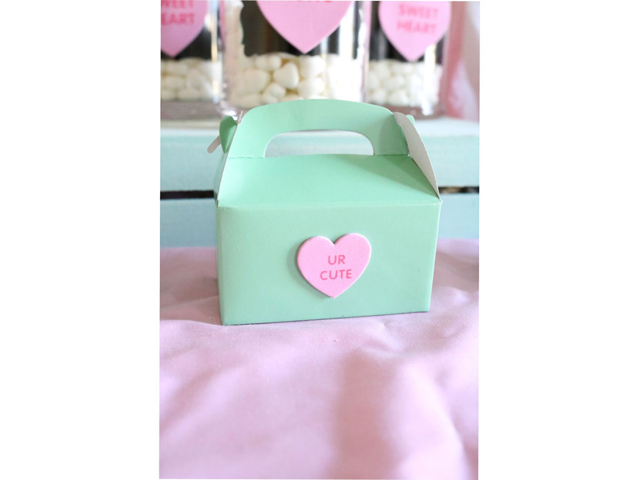 Lastly, we made sure to include Mini Mint Green Treat Boxes with Valentine Conversation Self Adhesive Foam Heart Stickers for our guests to bring home any extra sweets that they wanted to save for later!