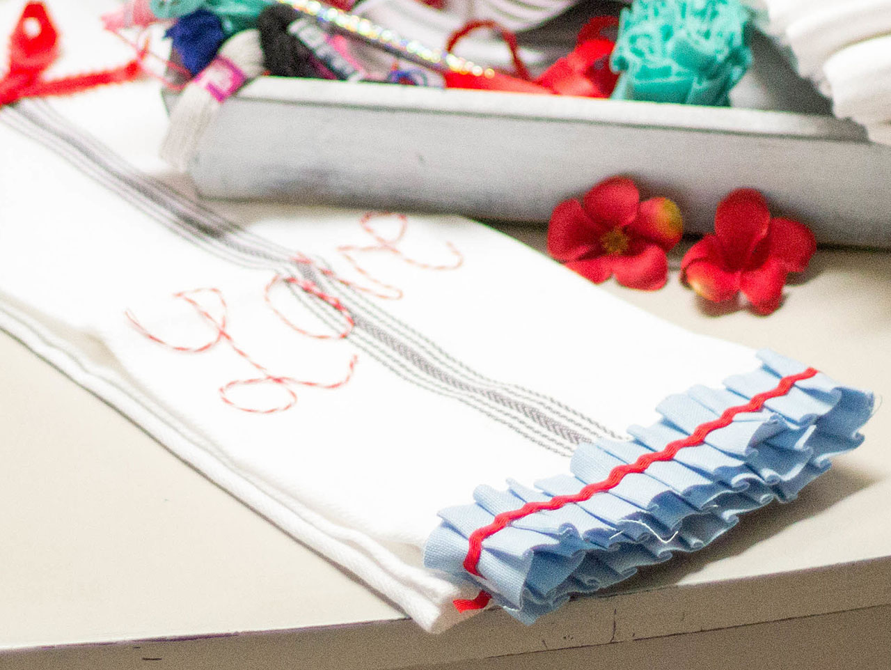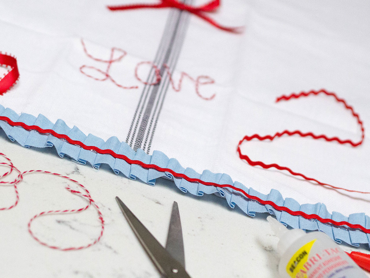 Try creating bows with brightly colored ribbons, or add buttons for a charming and whimsical design. Here, we stitched the words, “Happy Wife, Happy Life”, and added a cheery red ruffle.
