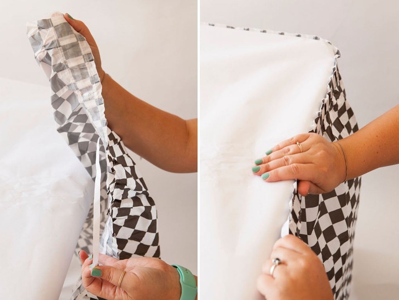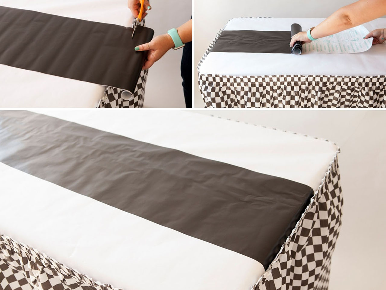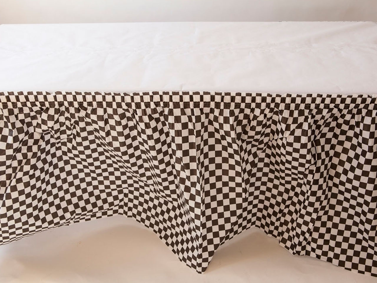 Cover a table with white art paper, I did this using packaging tape. This will protect the table and give the kids something to write on. Then apply the Black & White Checkered Pleated Table Skirt around the table.