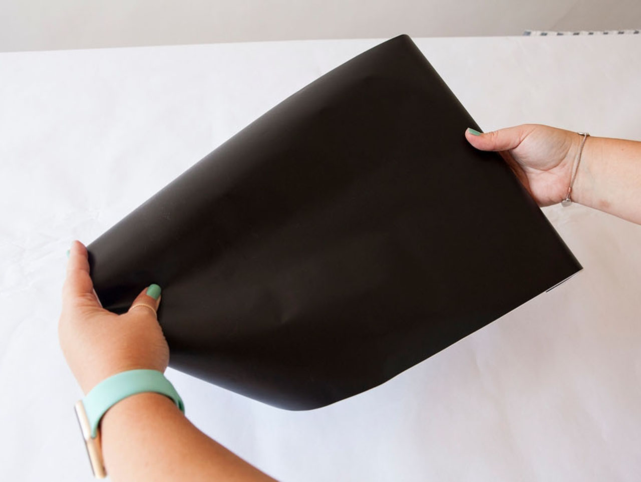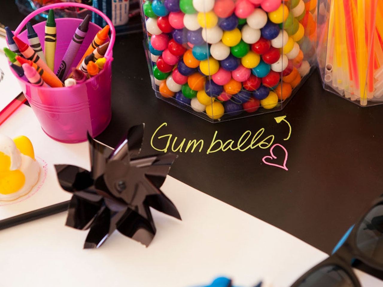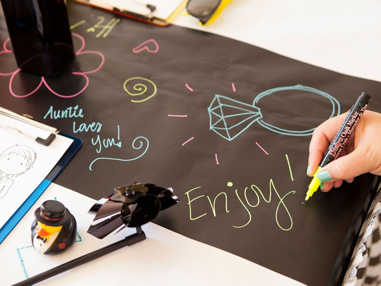 Using the Duck Chalkboard Deco Adhesive Laminate, measure the length of the table, remove the sticky backing and adhere it to the white art paper along the middle of the table. Think of this item as a long roll of awesome chalkboard sticker paper!