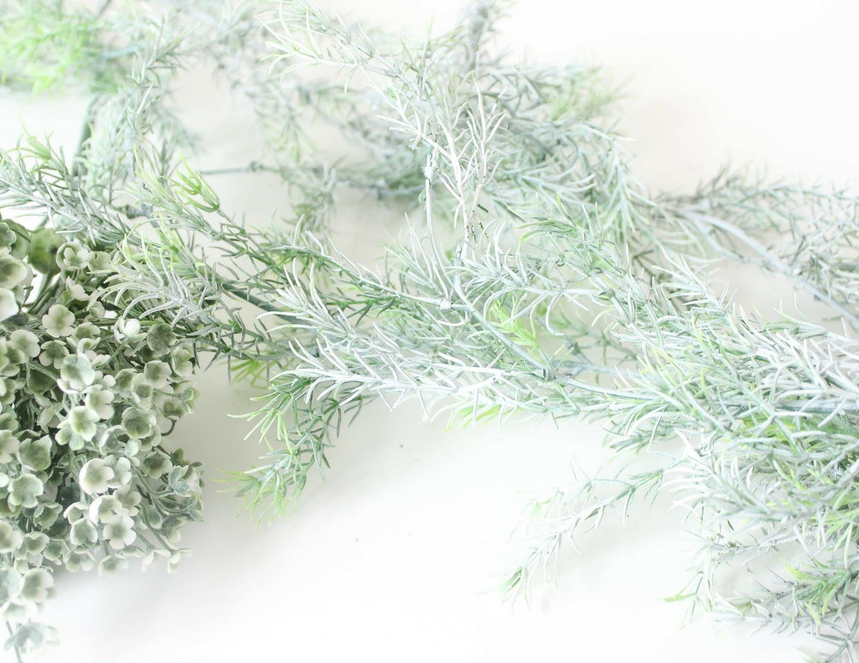 Next, add a light layer of white spray paint to some of the Faux Pine Branches and Faux Eucalyptus Stems to add a delicate wintry touch. Allow to dry.