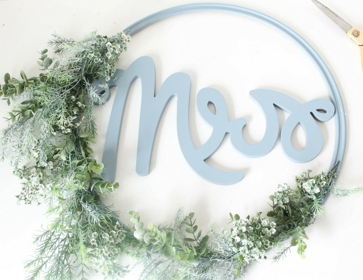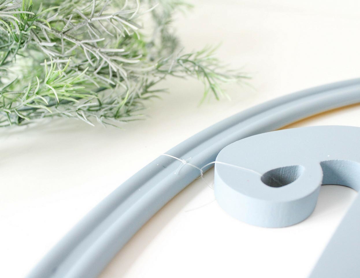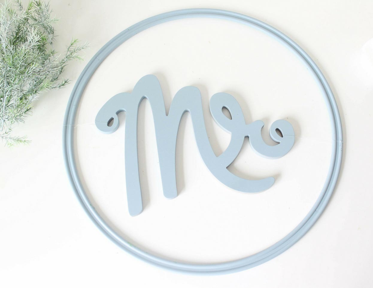 In order to attach the now slate blue painted Calligraphy Mr.and Mrs. Chair Signs, we are going to thread fishing line through the holes given on either side of each Sign. Place the Sign in the middle of the Ring to eye up the placement and then knot the fishing line on either side of the Sign and pull it taut and knot around the painted Ring so it will hang seamlessly in the center of the hoop. Repeat this step with the second sign and hoop.