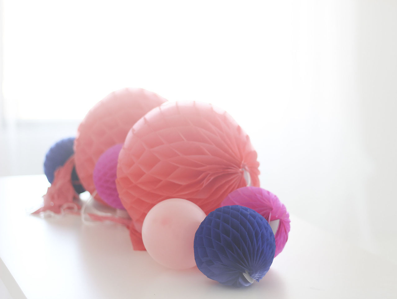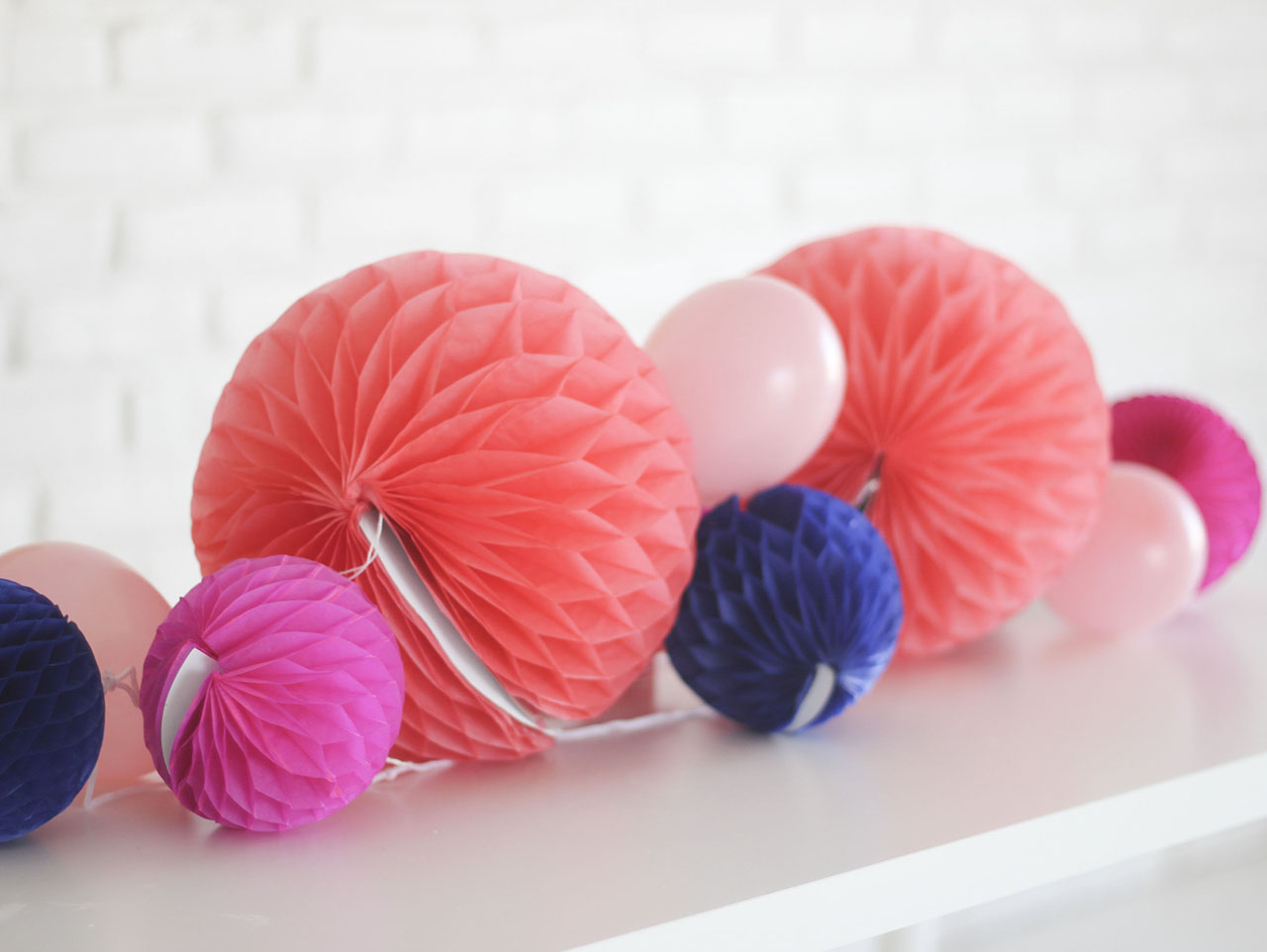Lay out the honeycomb garland onto the table top and tape into place. The great reason to use tape is that it makes it easy to change and rearrange whenever you need it. We started our table runner more spread apart and longer, yet as we continued to add and rearrange, we realized that we liked it more bunched together in the middle of the table.