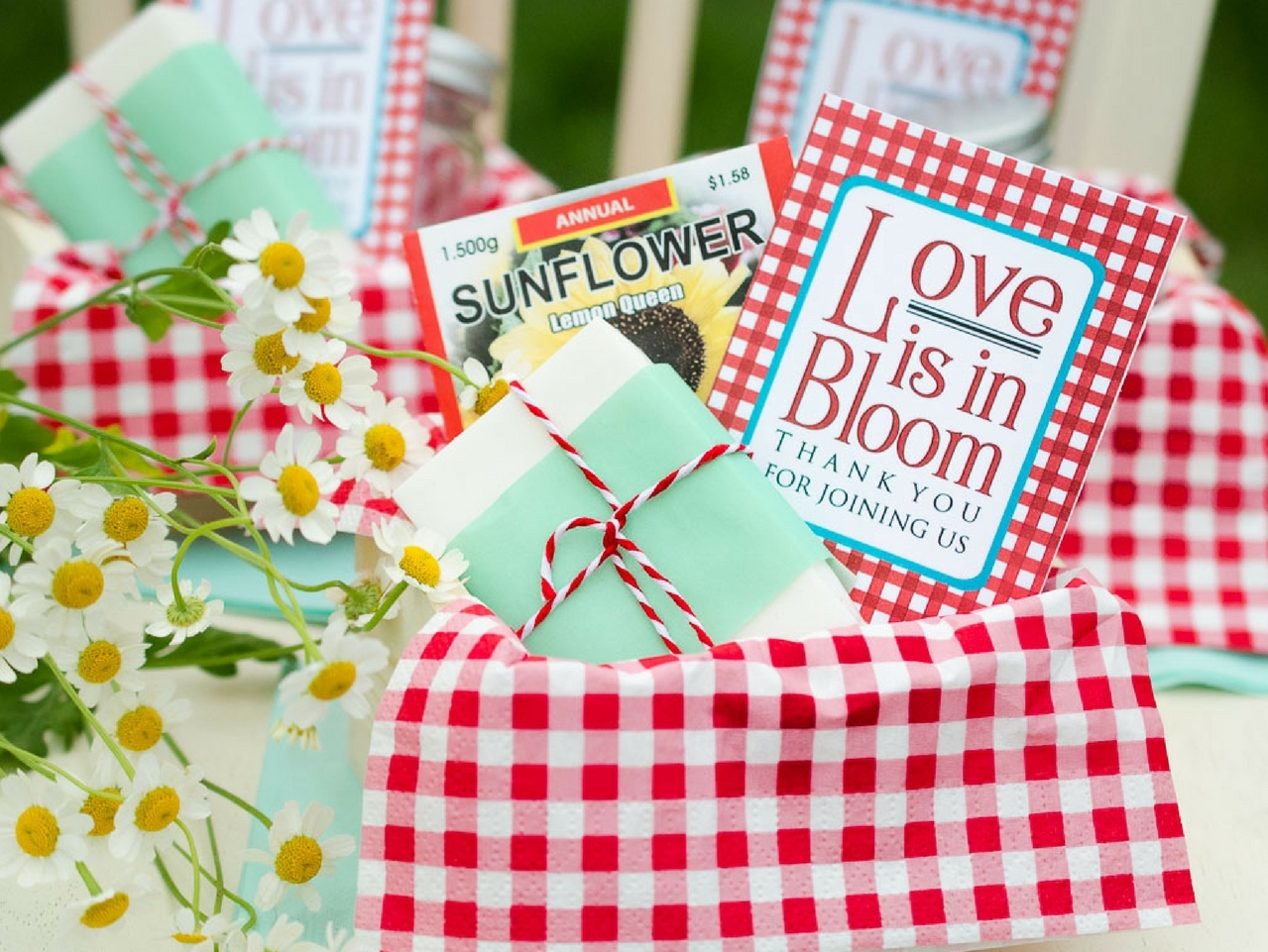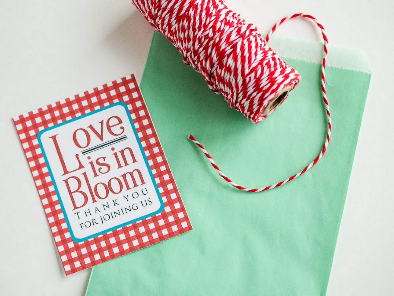 Wrap the strips of parchment bags around the bars of soap and secure with tape on the back of the bar. Tie with red bakers twine. Place soap inside mini wood crates lined with red gingham napkins. Tuck in flower seed packets and the "Love is in Bloom" favor tag.