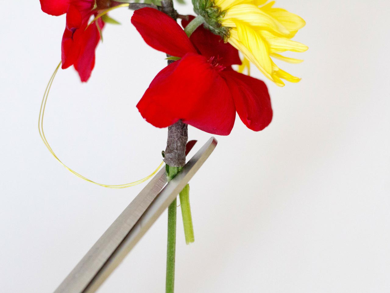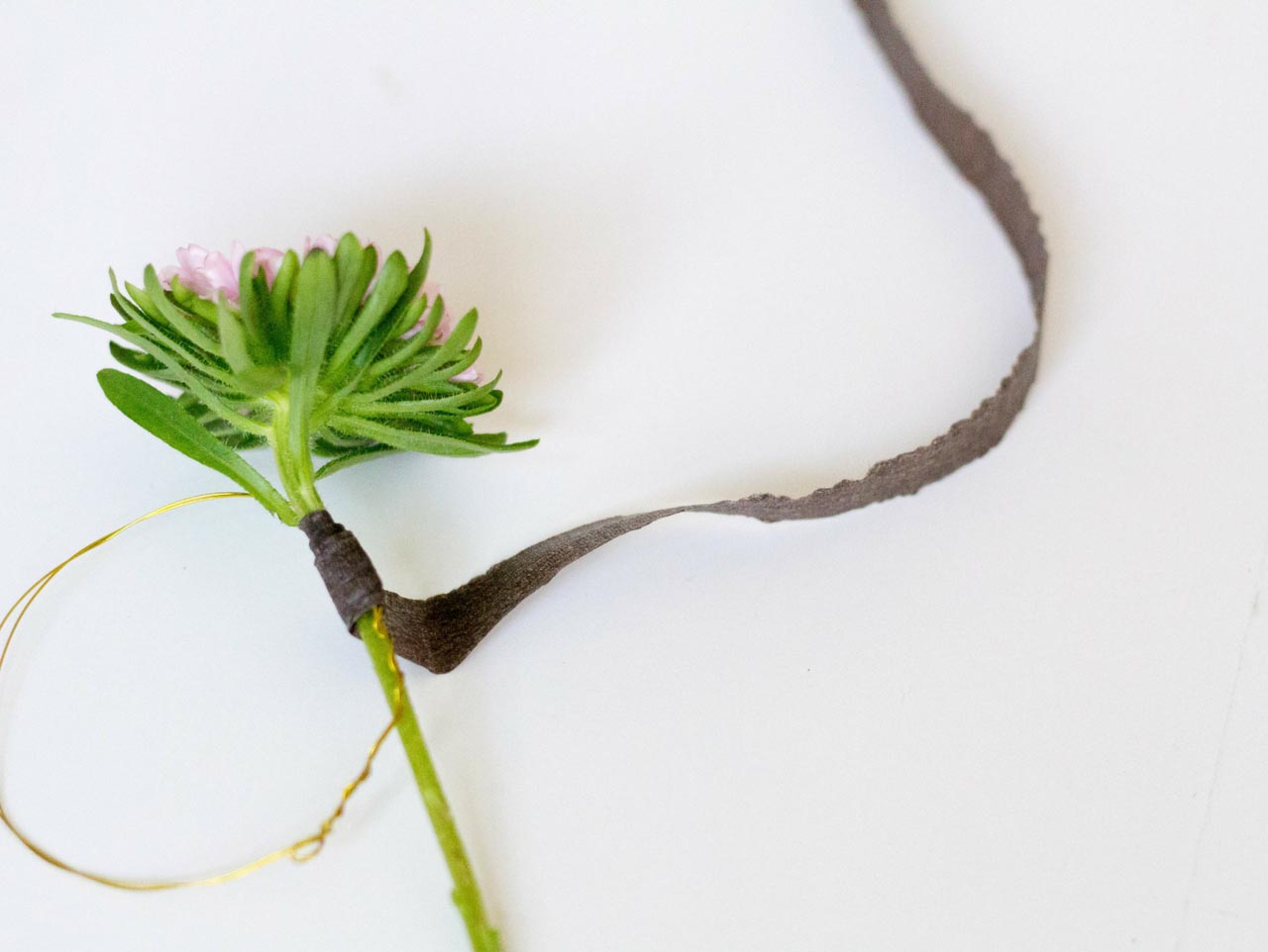 Use floral tape to carefully wrap the stem of a flower head and attach to the wire, as shown. Leave the stems on until the end, you’ll be trimming up your creation in a later step!