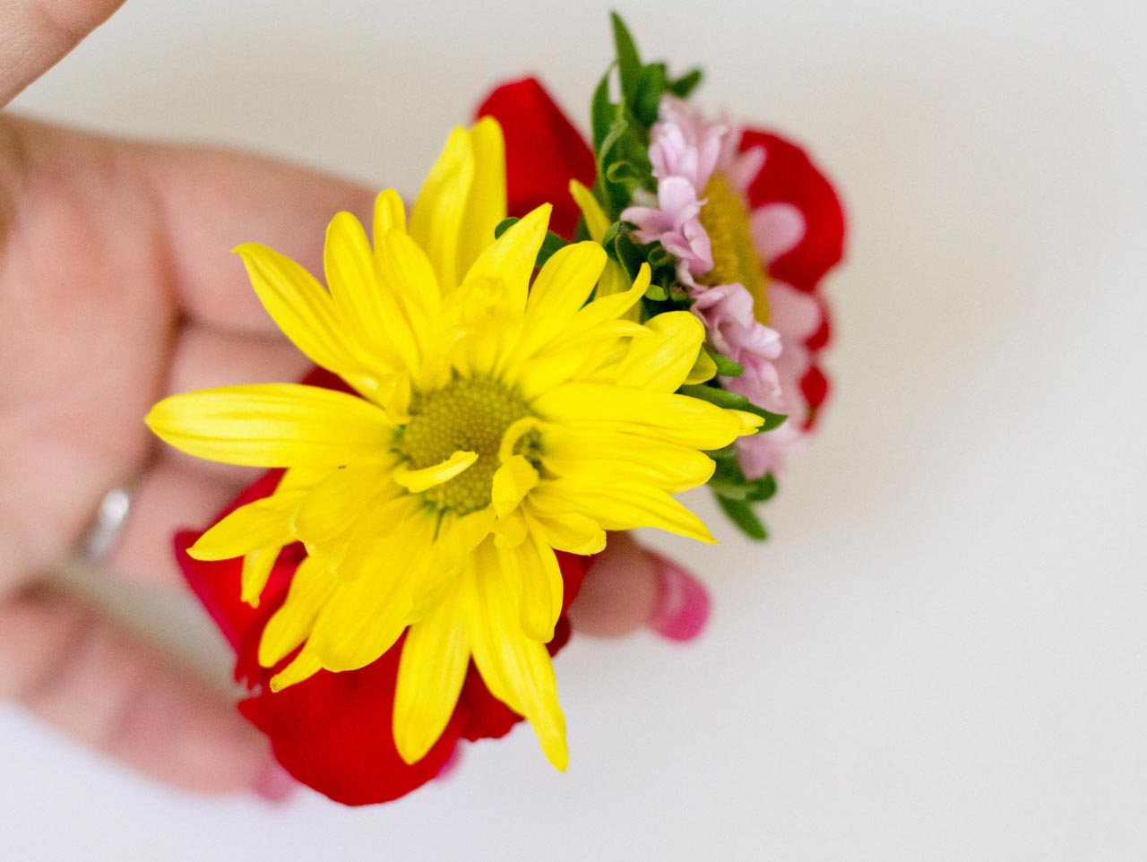 Continue attaching flowers as in the previous step. Place larger flowers toward the center, and add smaller heads on the sides. Flowers look great in odd bunches, so cluster like blooms in counts of 1, 3, or 5 for a well balanced look. Once the ring is covered fully across one half, trim the ends with scissors or floral snips. (Don’t trim too close to the tape!)