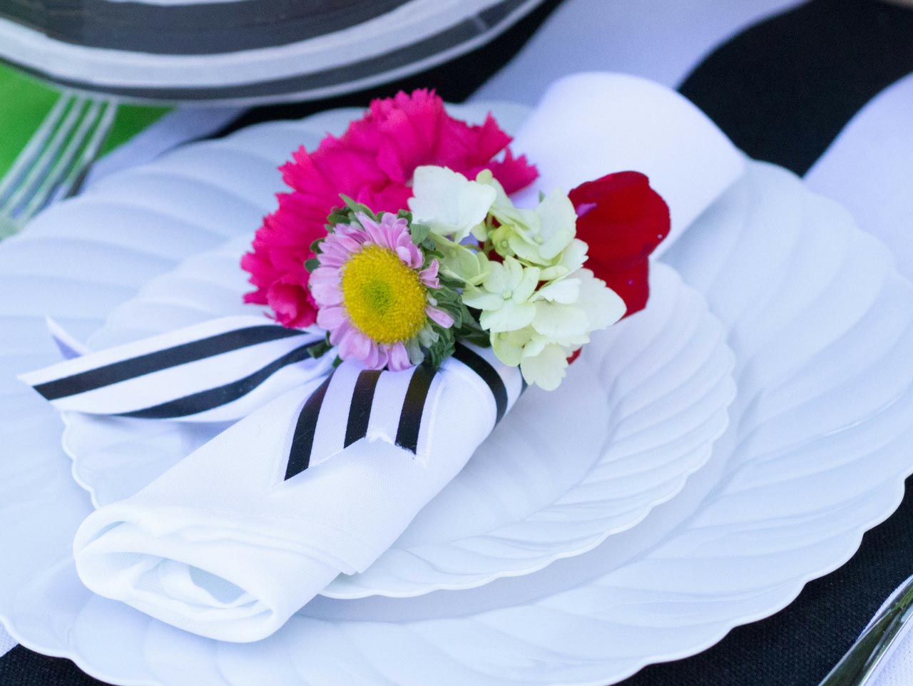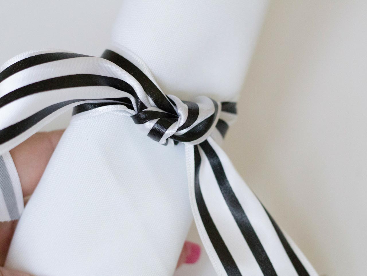 Cut a length of the Black and White Striped Ribbon to about eight inches, and wrap around one of the White Polyester Linen Napkins. Secure gently in the center with a relaxed knot. Use scissors to cut the ends of the ribbon at an angle for a crisp, clean and finished look.
