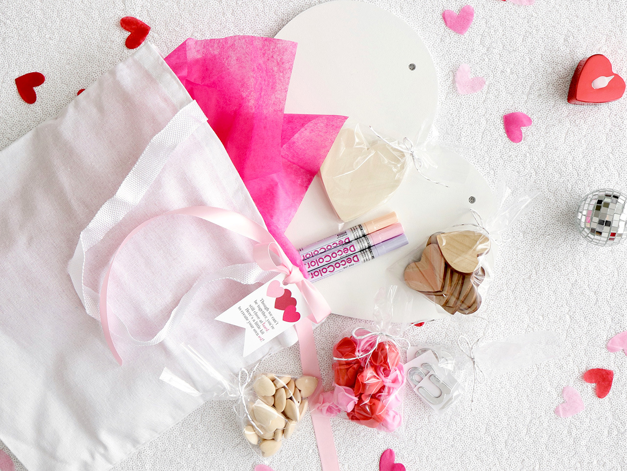 Finally, create a little craft kit for your gals who couldn't attend. We placed a sampling of various craft items into Small Cellophane Bags and tucked them, along with a White Heart Sign, into DIY Large Canvas Tote Bags with a bit of pink tissue paper. We then tied a free printable tag that was printed onto white cardstock with pink ribbon onto each bag. You can find the free printable tag here. Be sure to check out our Galentine's Day Crafing Party Printable Pack here for more free printables. Get the step-by-step instructions to make 3 DIY Valentine's Day Signs and a Galentine's Day Balloon Garland as well!