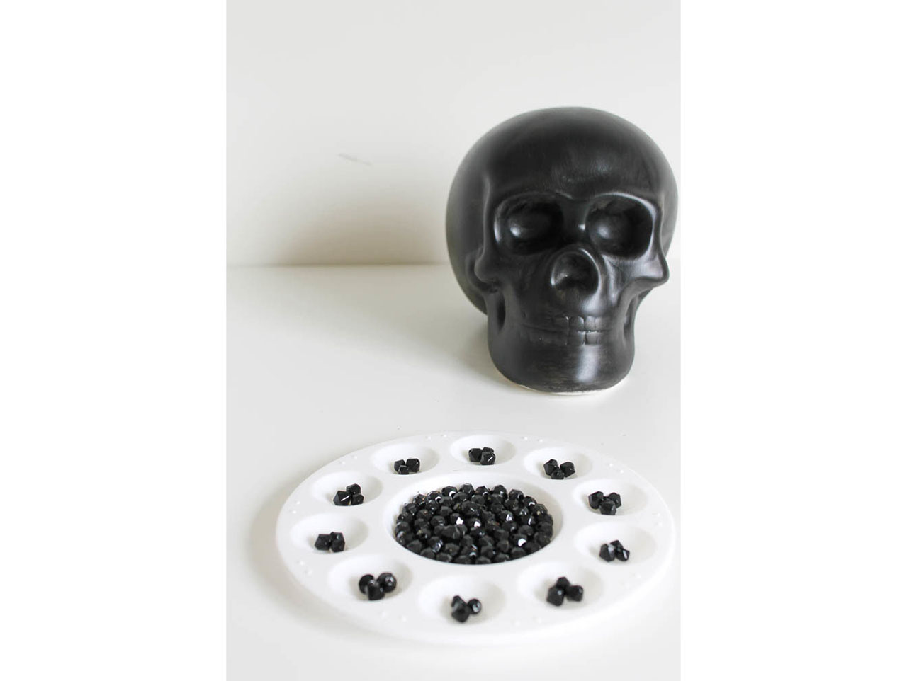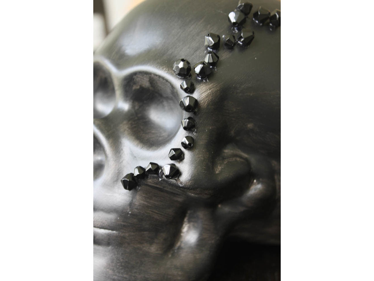 Once the paint has dried completely, use your hot glue gun to begin hot gluing a pattern of beadsonto the painted DIY Ceramic Skull. We decided to put the beading detail so it lined the cheek and eye of the DIY Ceramic Skull.