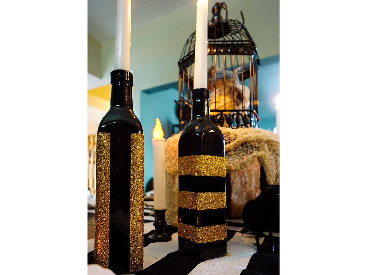 I used taper candles, but did have to shave the bottles to have them fit perfectly. I just love how they look on my table, and the glitter adds just that hint of sparkle as the candlelight flickers.