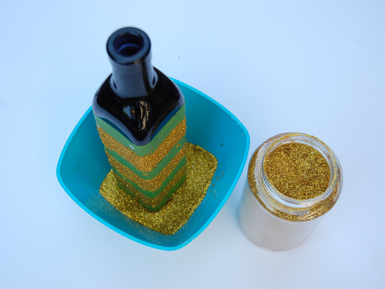 Carefully pour glitter over all the Mod Podge. You will need to work quickly at this point because the Mod Podge does dry fast. I found it best to do just one bottle at a time.