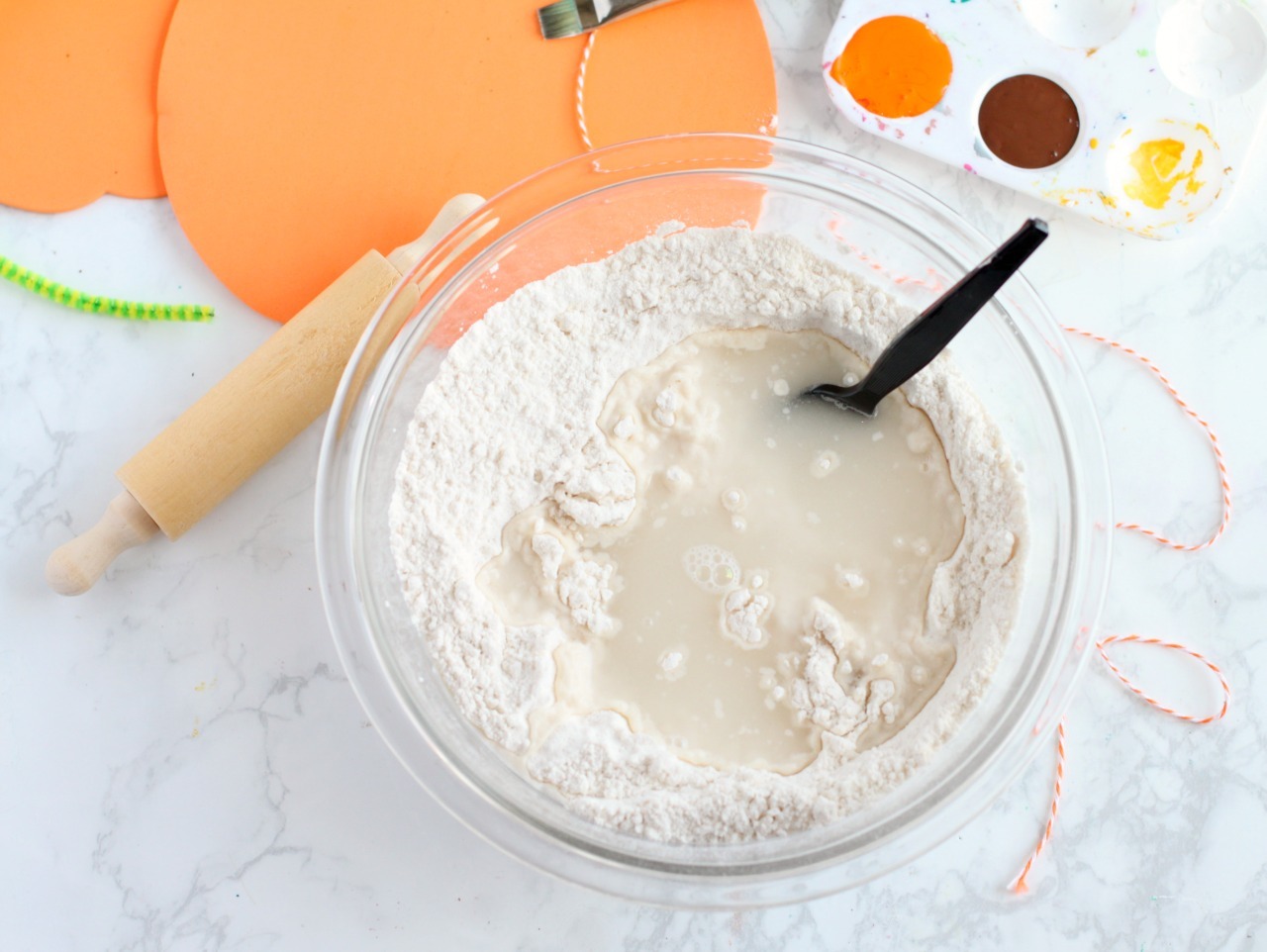 Combine 2 cups of flour, 1 cup of salt and 1/2 a cup of warm water in a medium bowl.