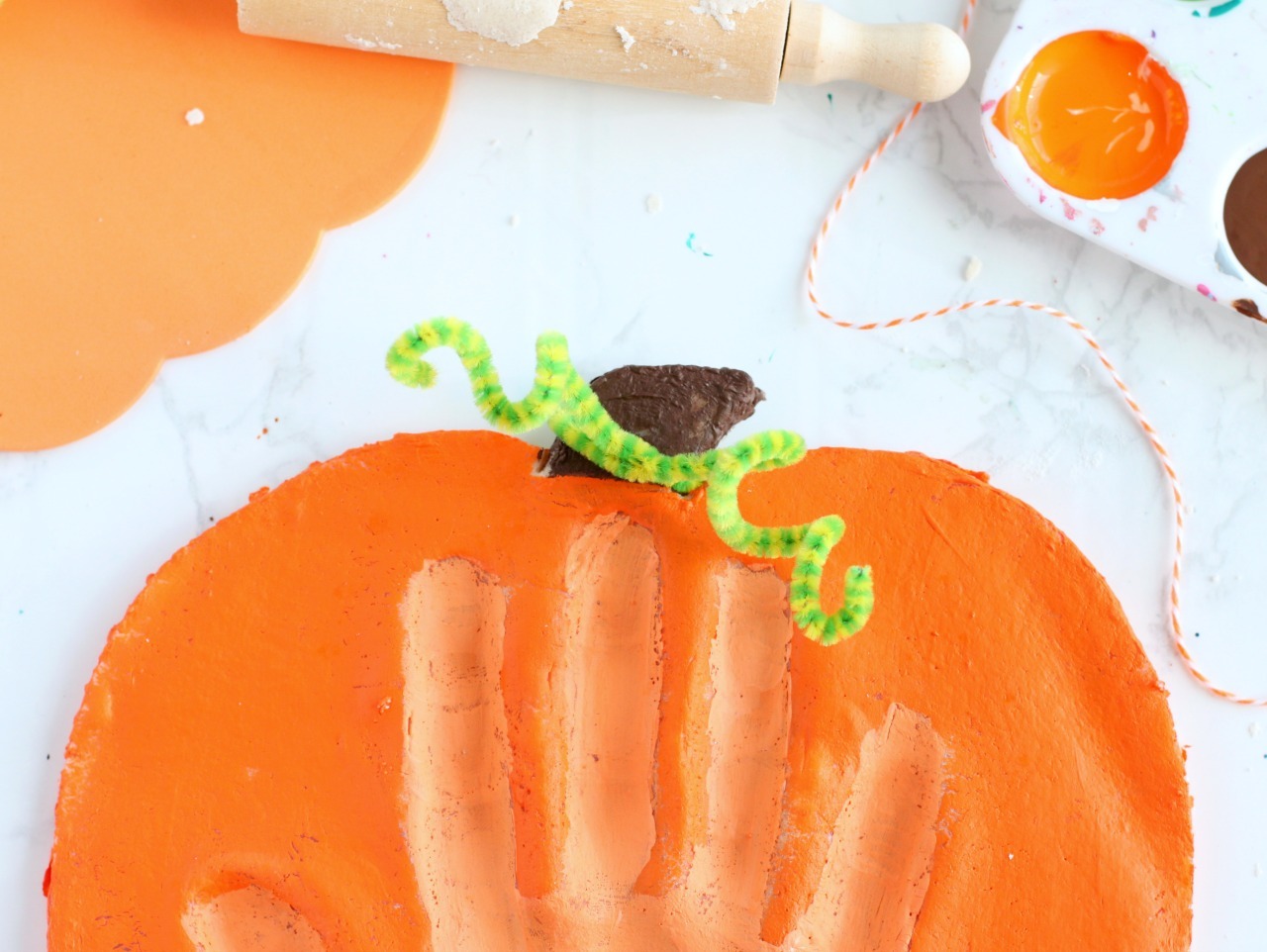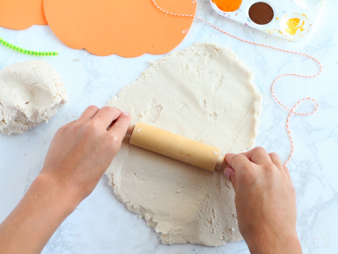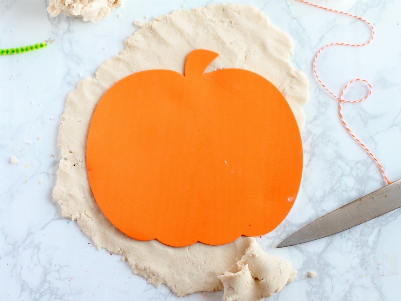 Use the pumpkin jumbo fall shape (or draw your own pumpkin shape on paper or cardstock) to cut out a salt dough pumpkin. You can also draw your own pumpkin shape on paper or cardstock to use as a guide for cutting your salt dough pumpkin.