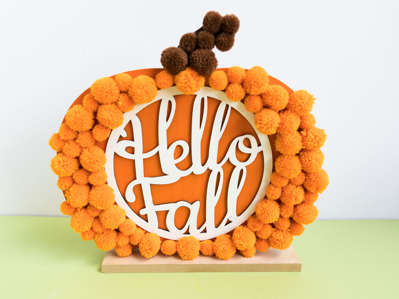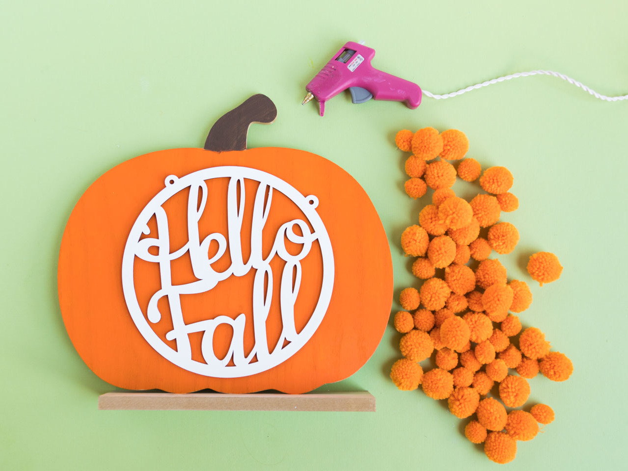 Glue the Hello Fall sign to the front of the painted pumpkin with hot glue.