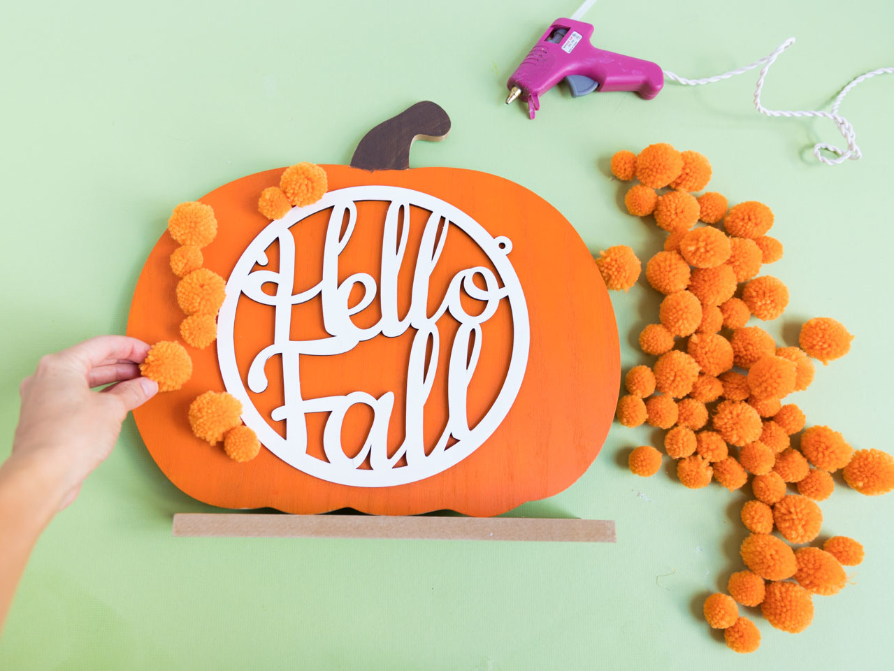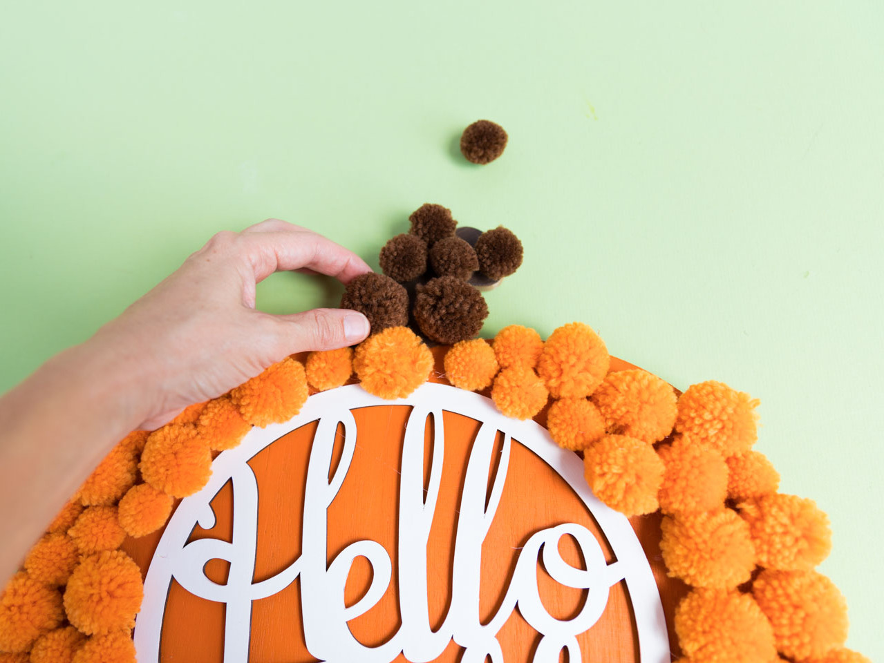 Add orange yarn pom-poms all around the pumpkin. You will need three packages of pom-poms to cover it completely. Glue brown yarn pom-poms on the stem.