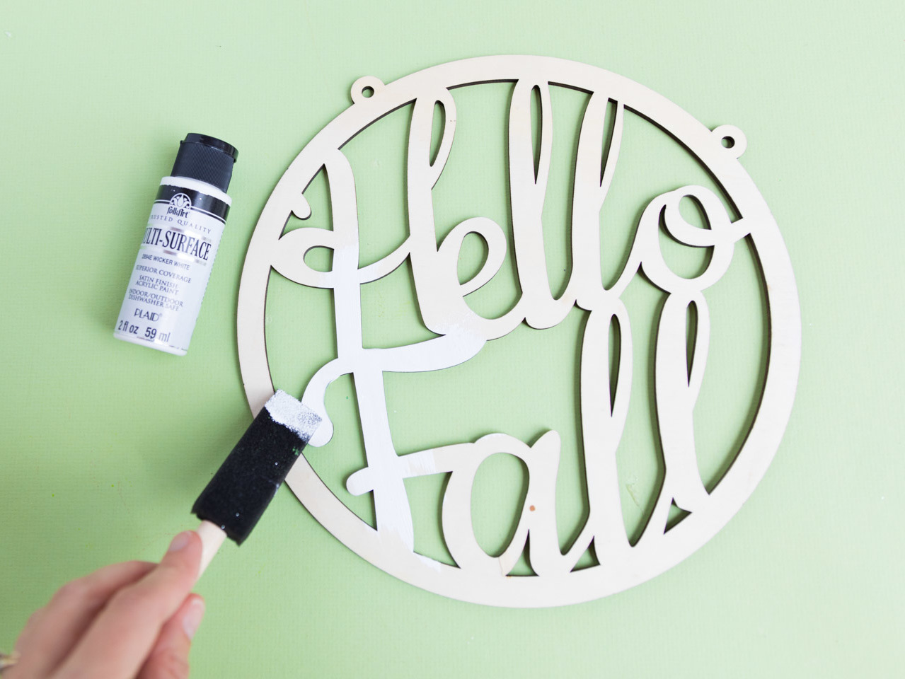 Paint a "Hello Fall" sign from this set of DIY wood fall cutouts with white acrylic craft paint.