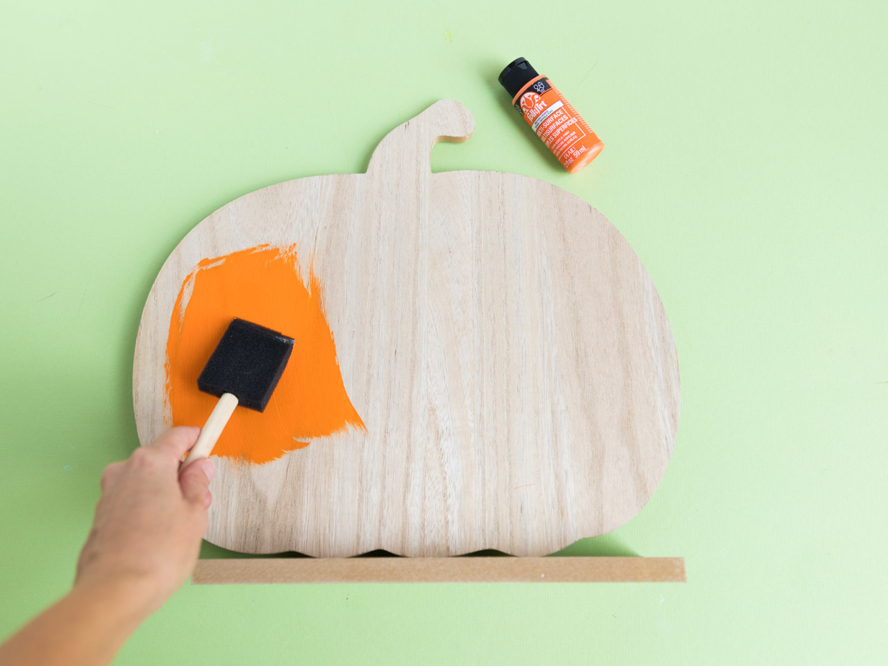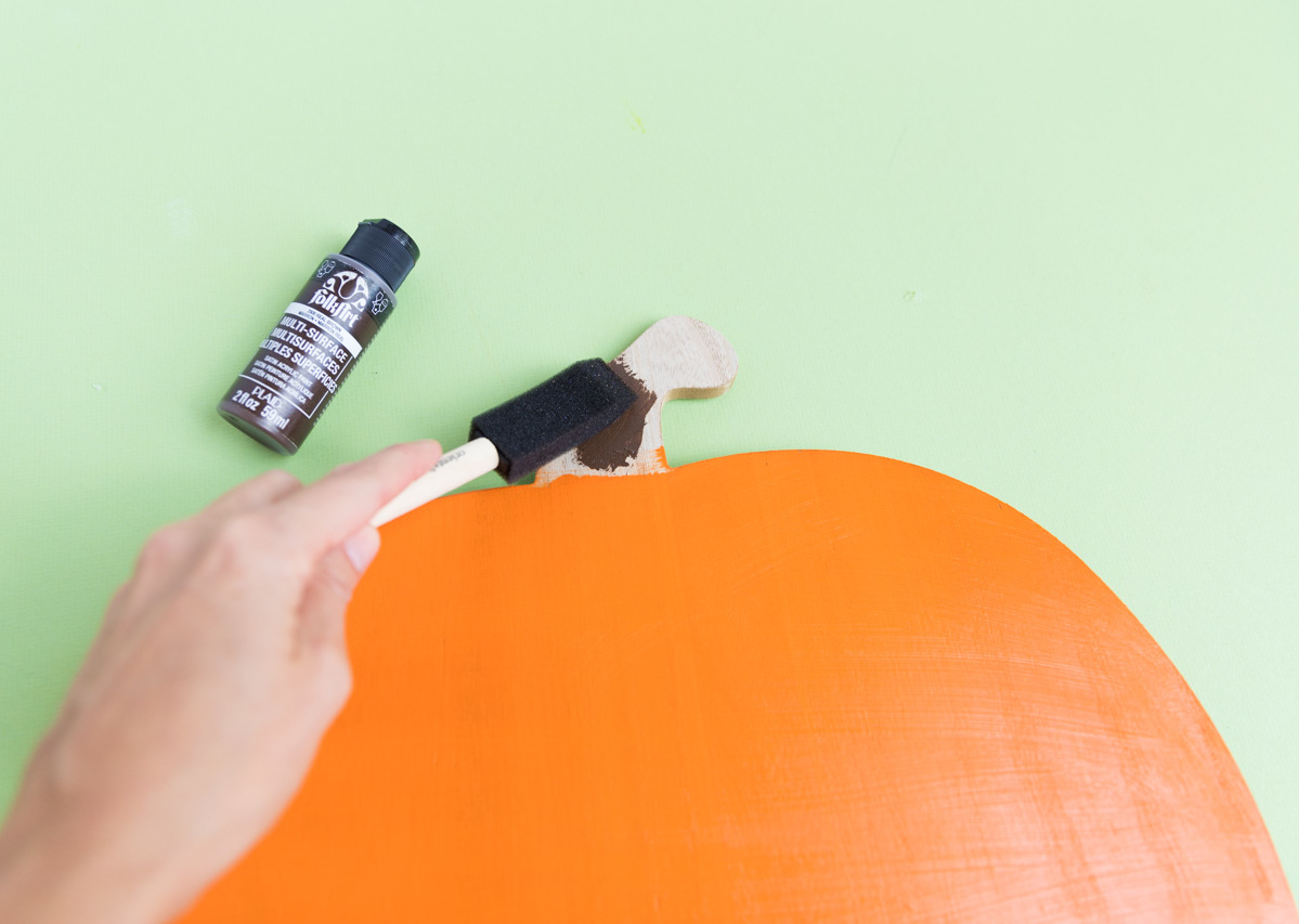 Paint the main part of a DIY unfinished wood pumpkin with orange acrylic craft paint and a foam brush. Paint the stem brown. Let dry.