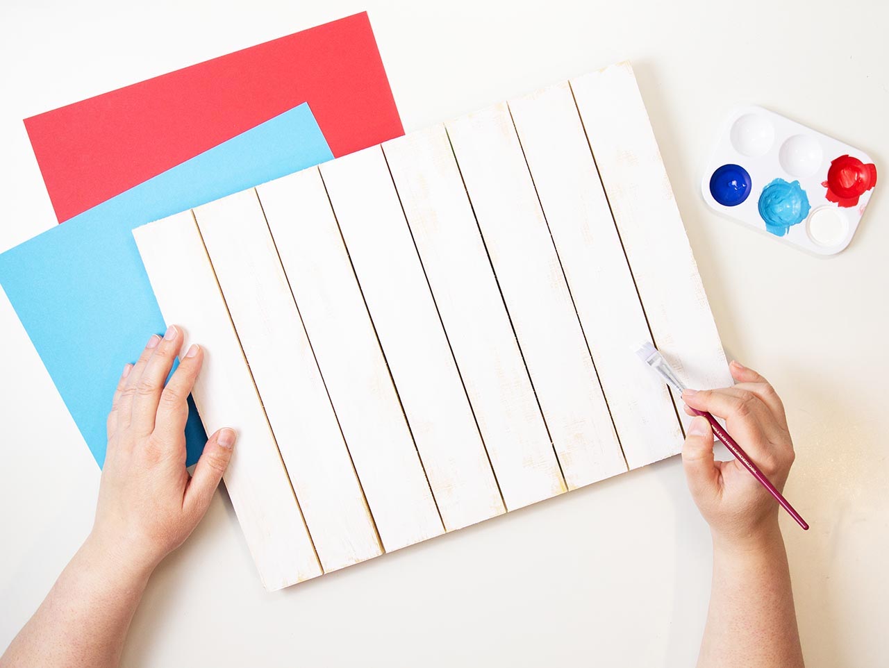Start by dry brushing white acrylic paint on the DIY slat sign to create a rustic look. Dry brushing is a technique where you use a paint brush "dry" to paint without using any water on the brush.