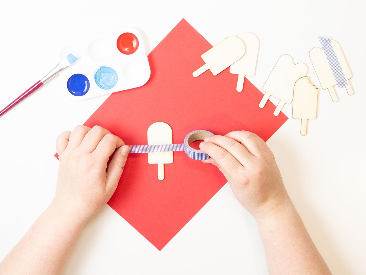 While drying, washi tape and paint the mini wood popsicles. We painted ours in patriotic colors using red, white and blue acrylic paint.