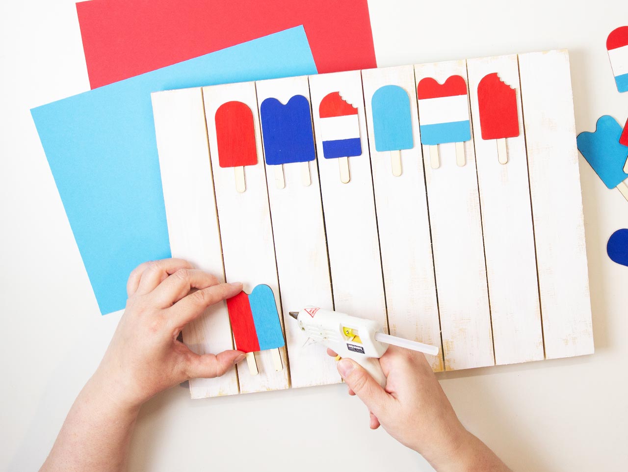 Once dry, hot glue the wood popsicles to the sign.