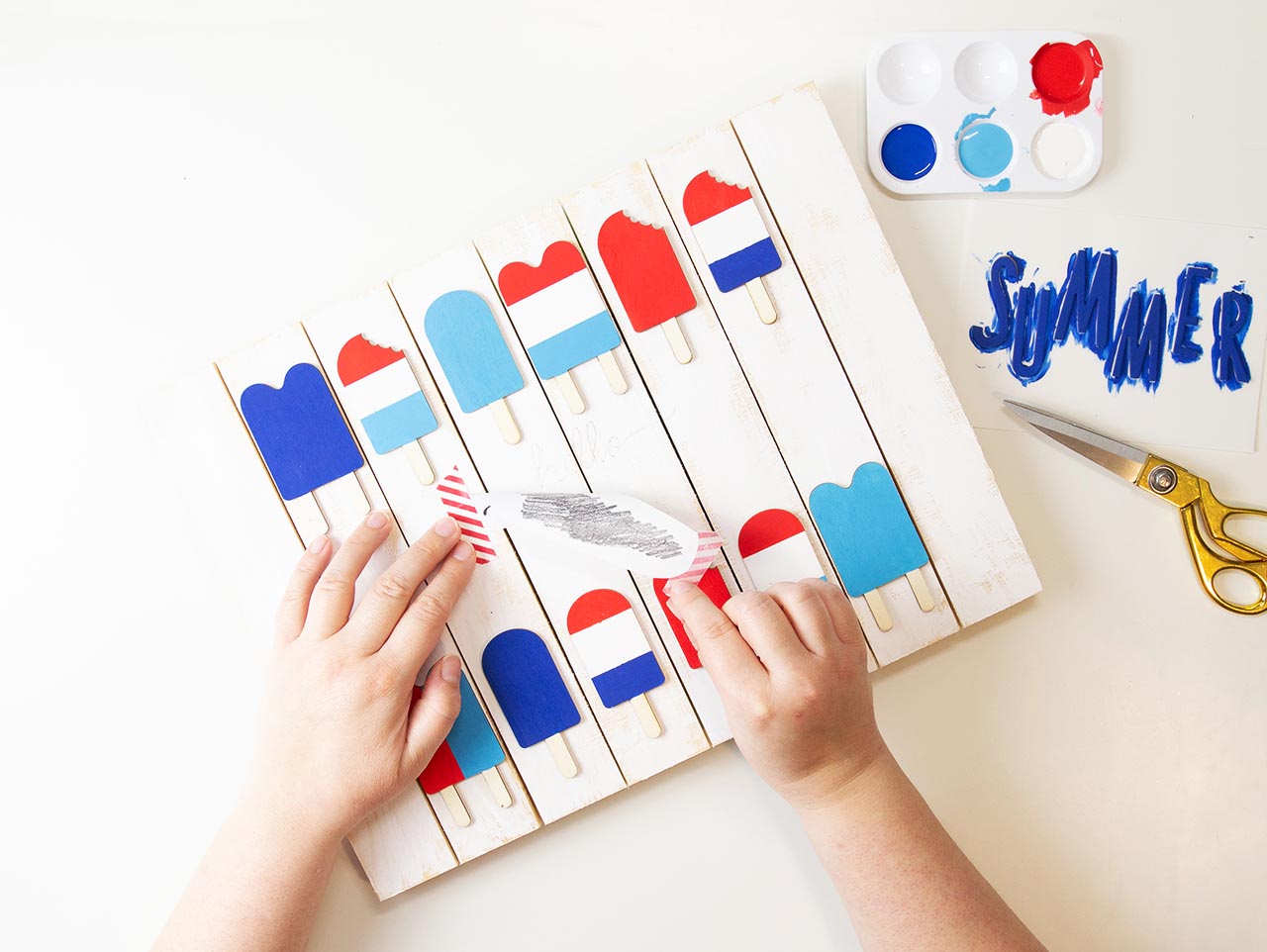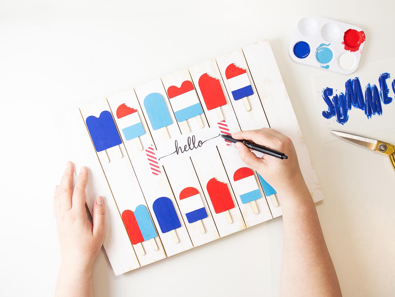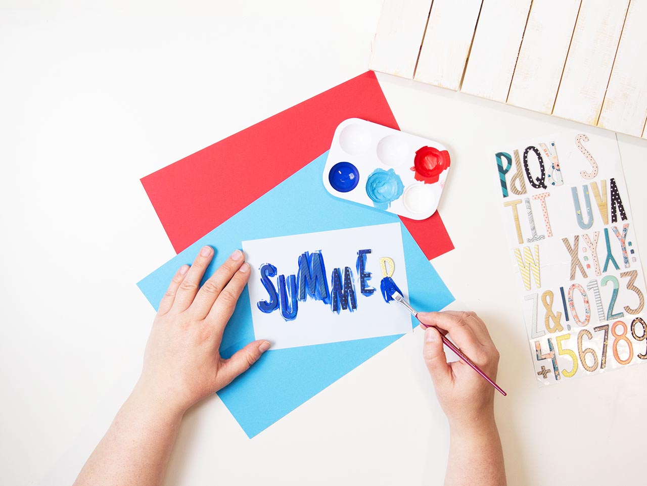 Next, paint the letters for “Summer” using blue acrylic paint. Set aside to dry.