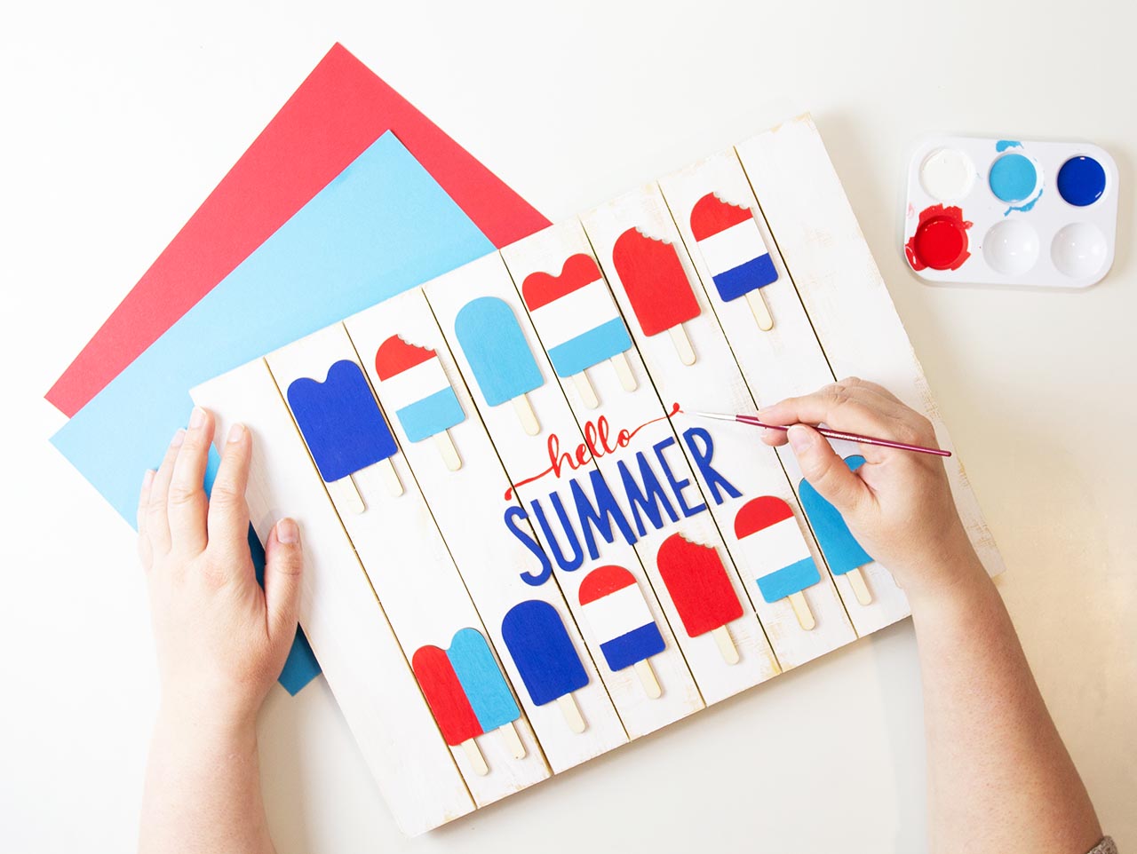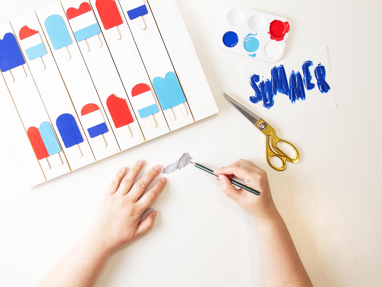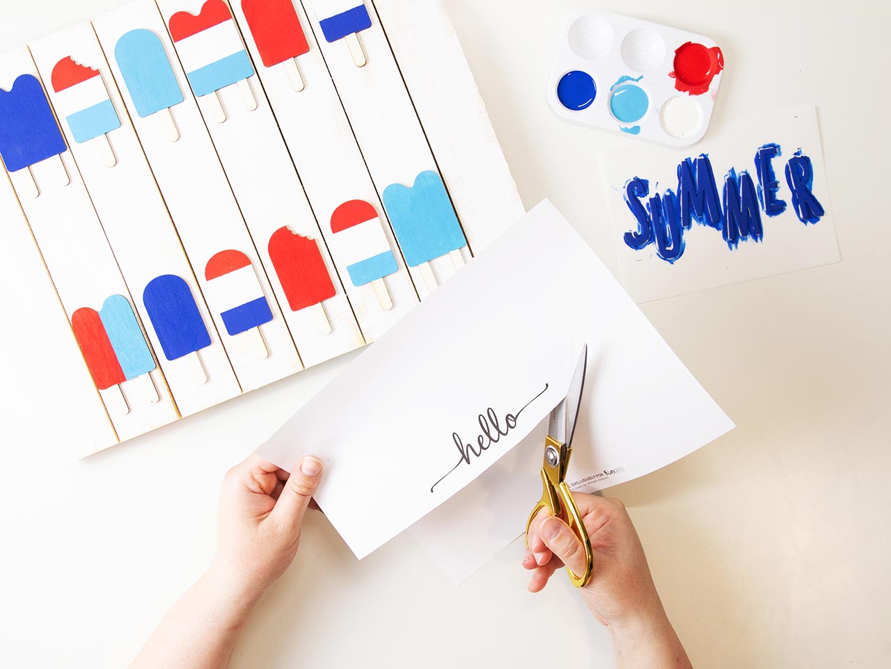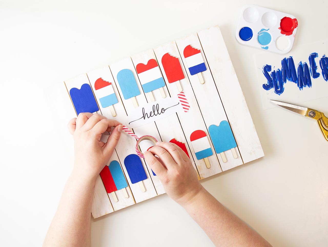 Next, paint the letters for “Summer” using blue acrylic paint. Set aside to dry.