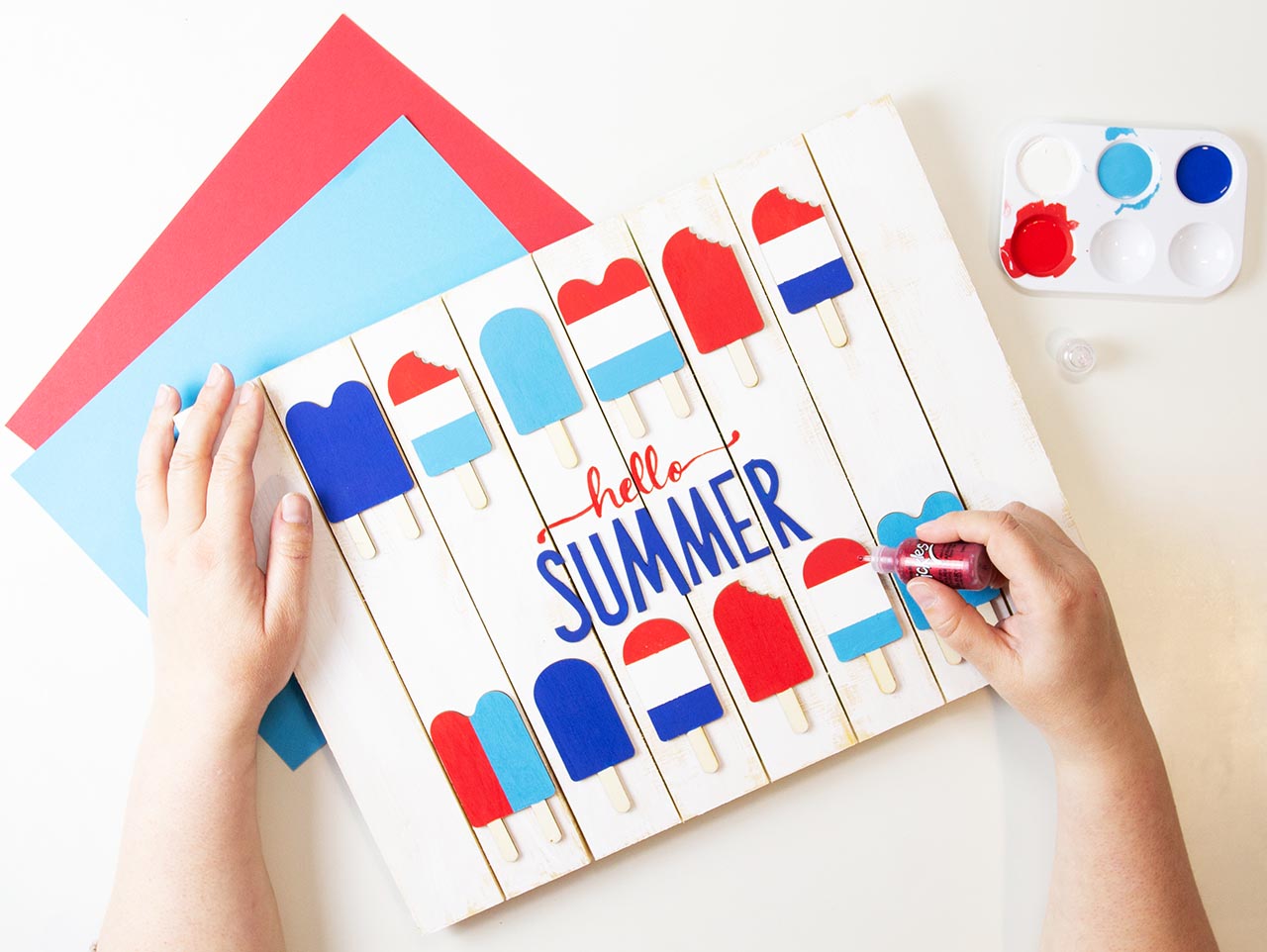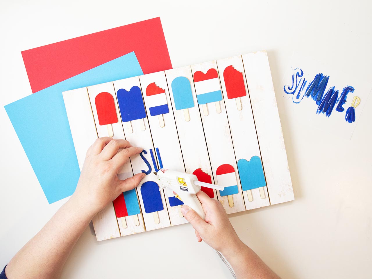 Once the Summer letters are dry, attach them to the wood sign with hot glue.
