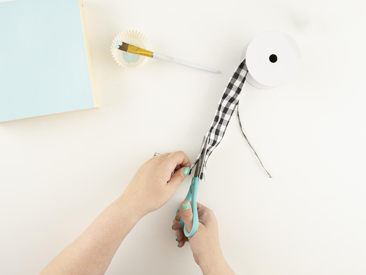 While the paint is drying, cut the wire ends off of a length of Black & White Buffalo Plaid Ribbon.