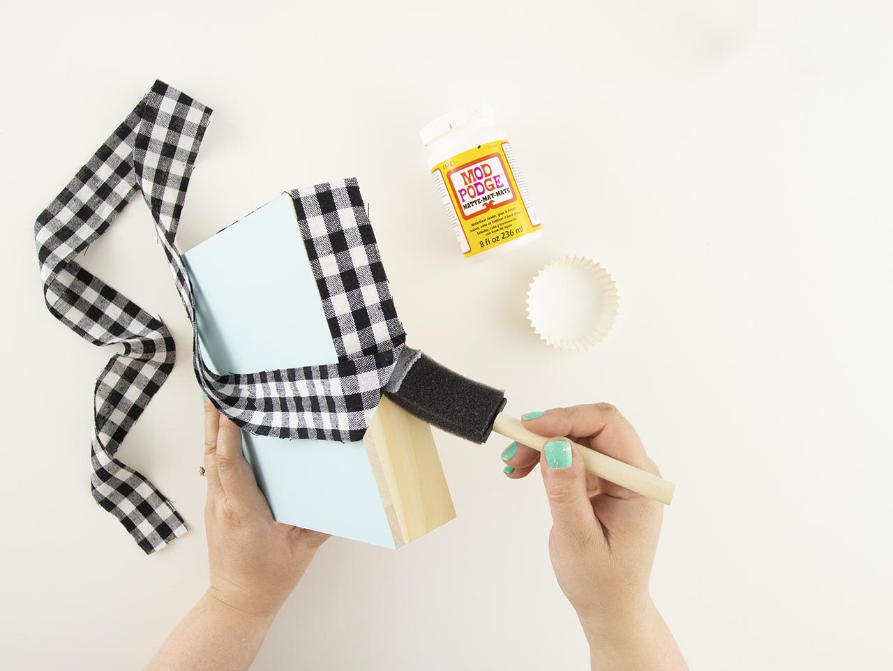 Once the paint on the wood sign is dry, apply a layer of Matte Mod Podge onto the sides. While the Mod Podge is still wet, apply ribbon around the sides of the wood sign, smoothing it down as you apply.