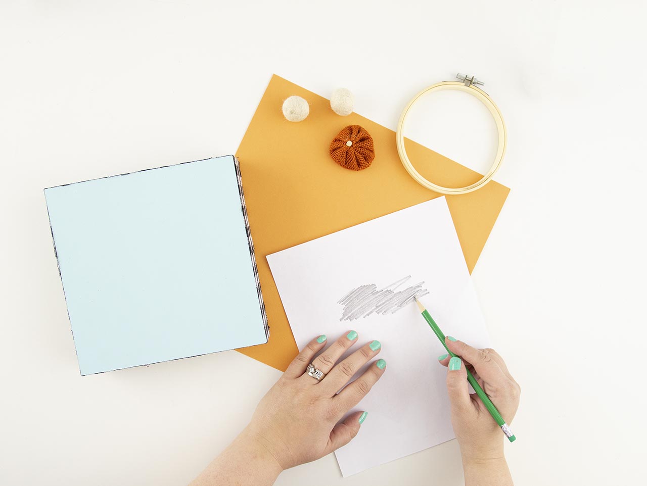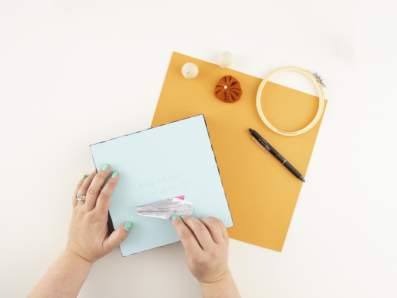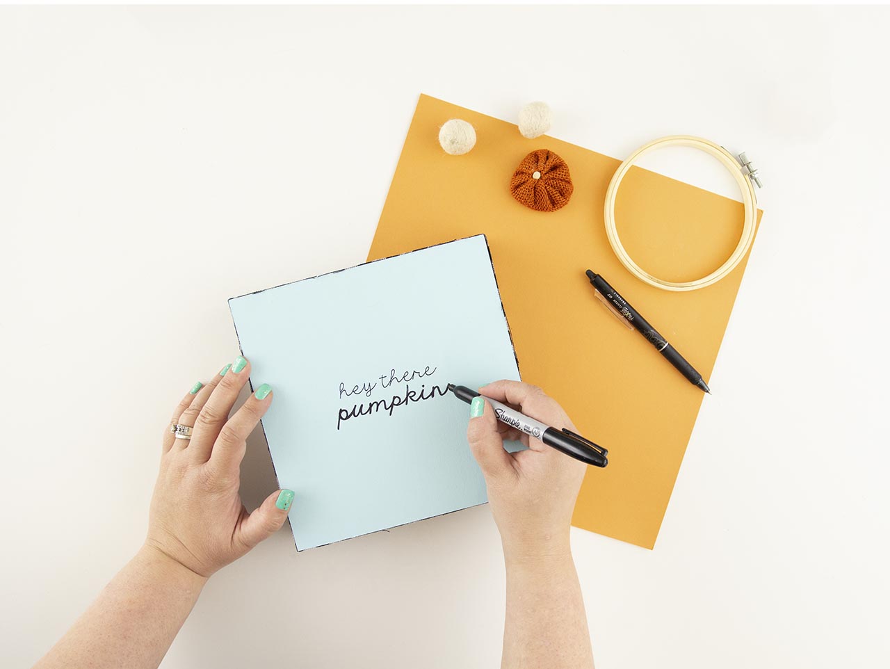 Download, print and cut out the Hey There Pumpkin Template. Rub a pencil onto the back of the template. Use washi tape to place the template onto the Medium Basswood Canvas and then use a ballpoint pen to trace the printable.This process transfers the words onto your project. Once you've finished tracing, remove the template to reveal the traced words underneath. You can download the Hey There Pumpkin Template here.