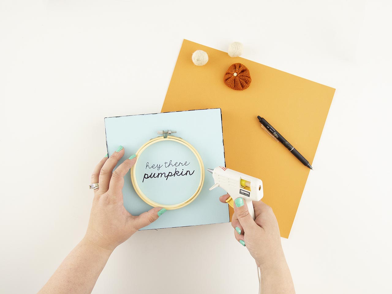 Adhere a Small Embroidery Hoop to the sign using hot glue.