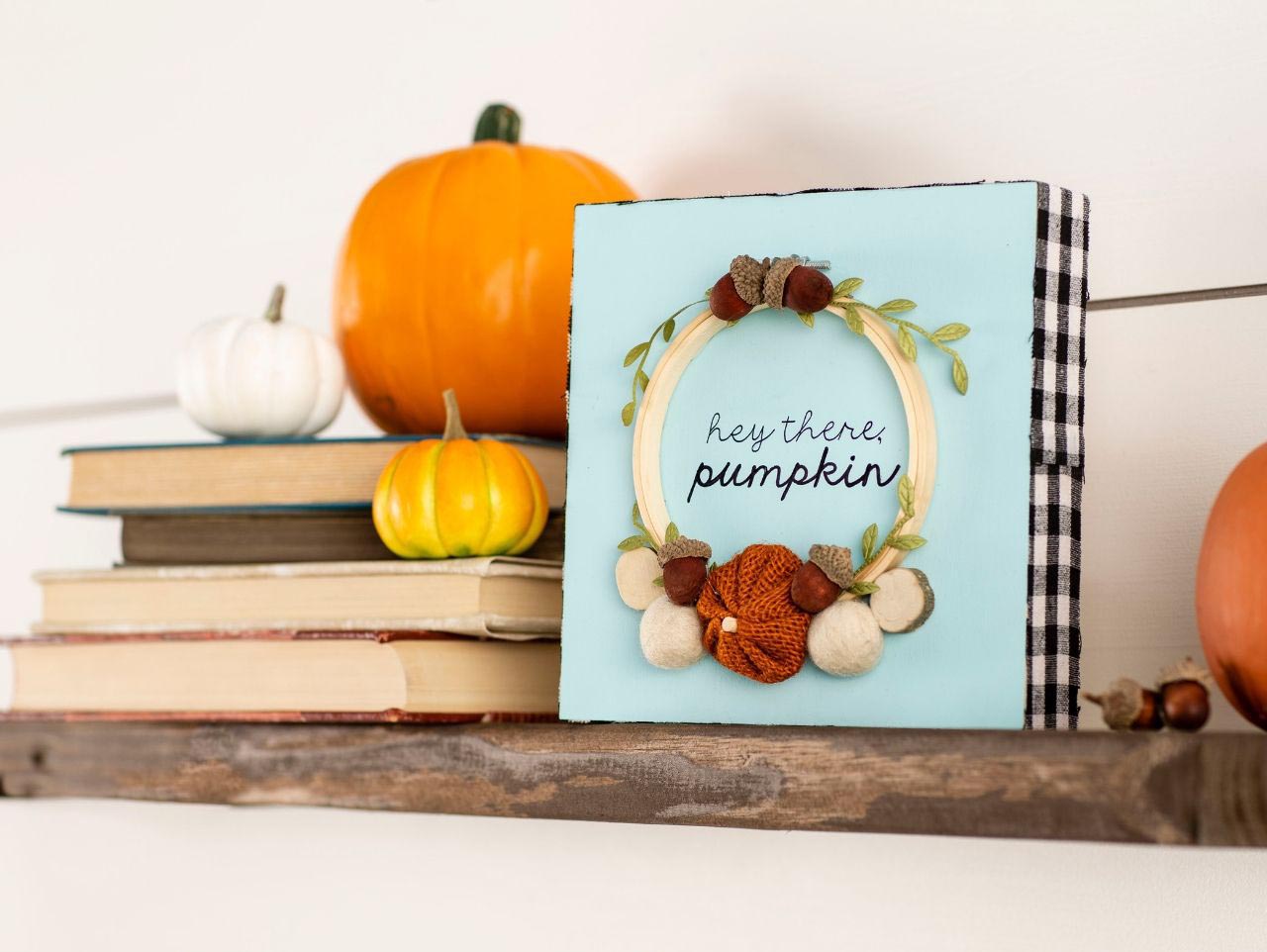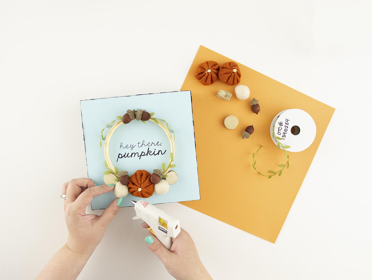 Use hot glue to embellish the sign with Small Wood Slices, Wool Felt Balls, Green Leaf Shaped Ribbon, Artificial Acorns and Fall Burlap Pumpkins.
